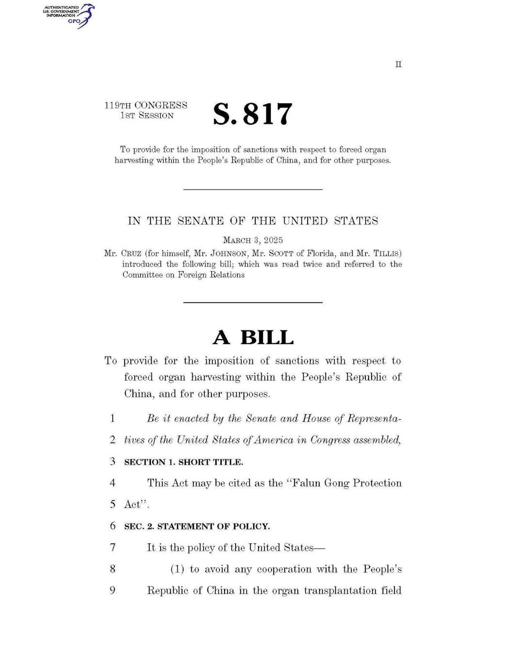 《法輪功保護法案》(S.817法案)由德克薩斯州共和黨聯邦參議員泰德﹒克魯茲(Ted Cruz)今年三月三日提出,法案指出中共仍在參與活摘法輪功學員的器官暴行。該法案將對那些參與強摘器官的個人或共謀實施制裁,對中共追責。
