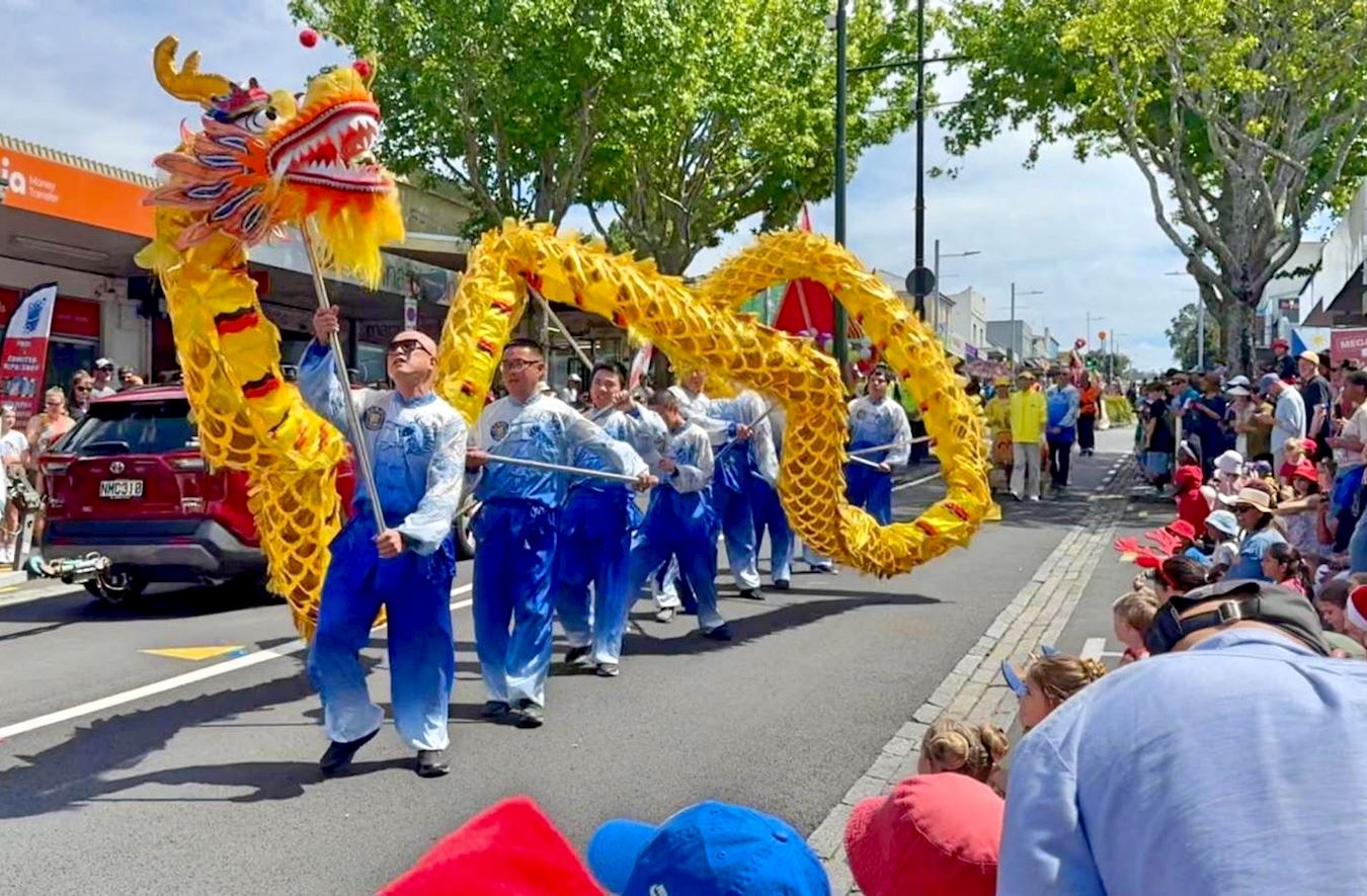 【明慧網二零二五年十一月二十五日】(明慧新西蘭記者站報導)二零二五年十一月下旬,新西蘭的每個城市又進入了聖誕節遊行季節,每個城市都洋溢著節日氣氛。新西蘭法輪功團體已經收到二十多個城市以地區的邀請,參加他們一年一度的聖誕大遊行。十一月二十二、二十三日週末兩天,由法輪功學員組成的天國樂團、舞龍隊、腰鼓隊分別參加了基督城、奧克蘭奧尼洪加(Onehunga)區、帕帕庫熱(Papakura)區的遊行。