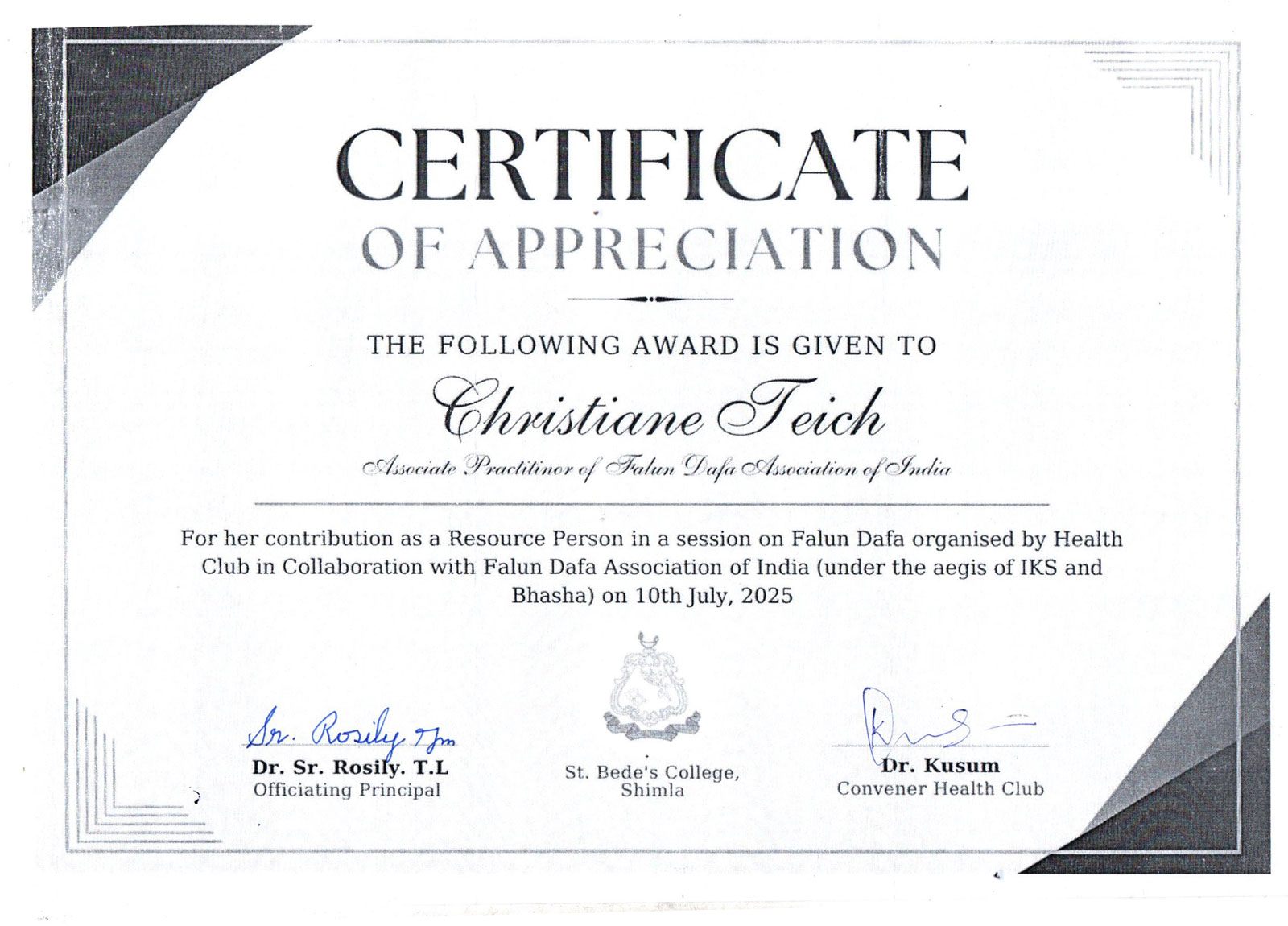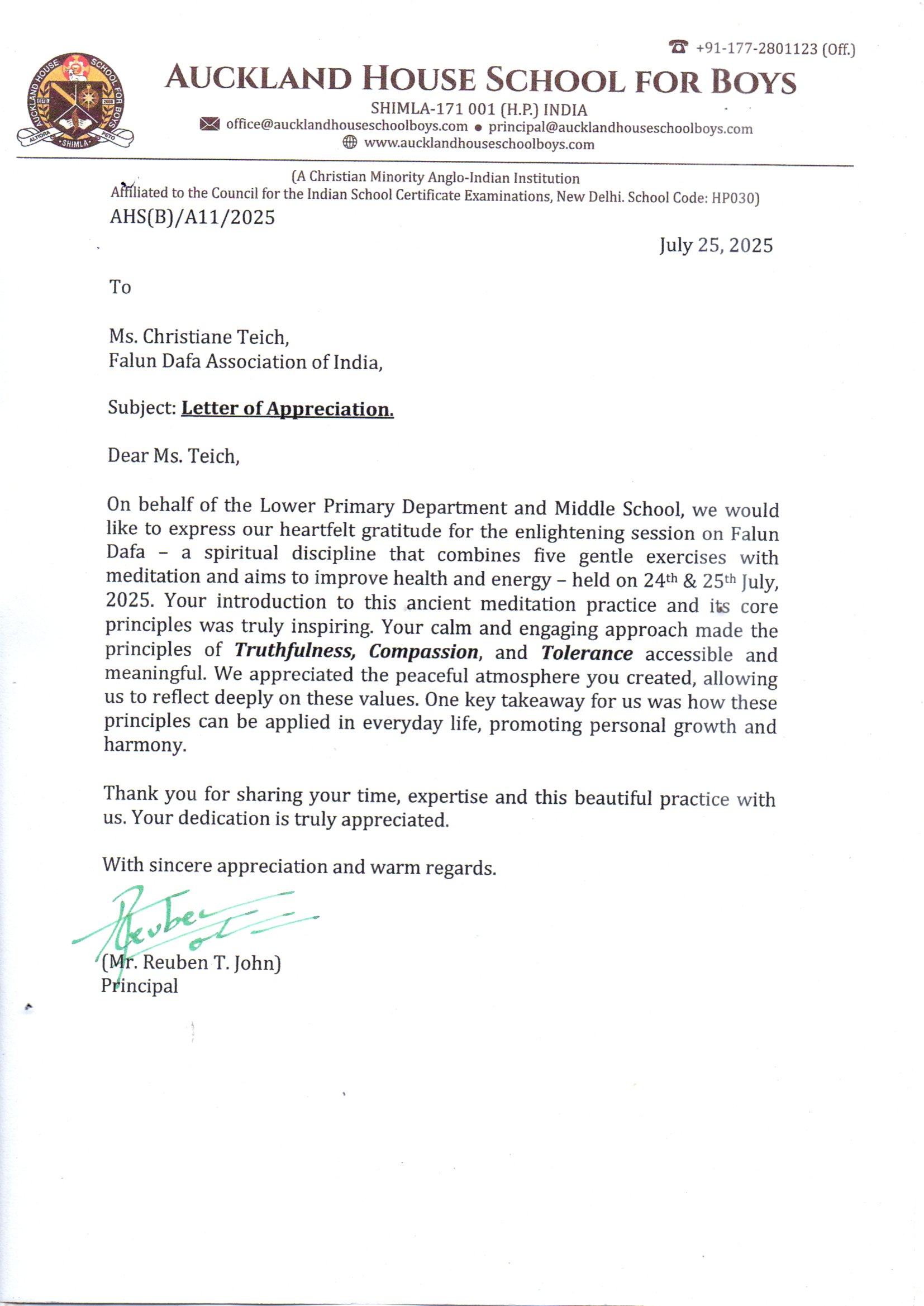 他寫道:「我謹代表學校,包括我們的學生、教職工,對您為我們學校各年級舉辦的鼓舞人心、意義深遠的法輪功教功班表示最深切的感謝。」