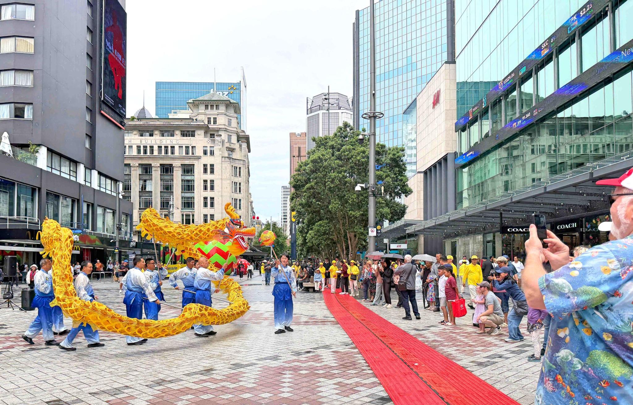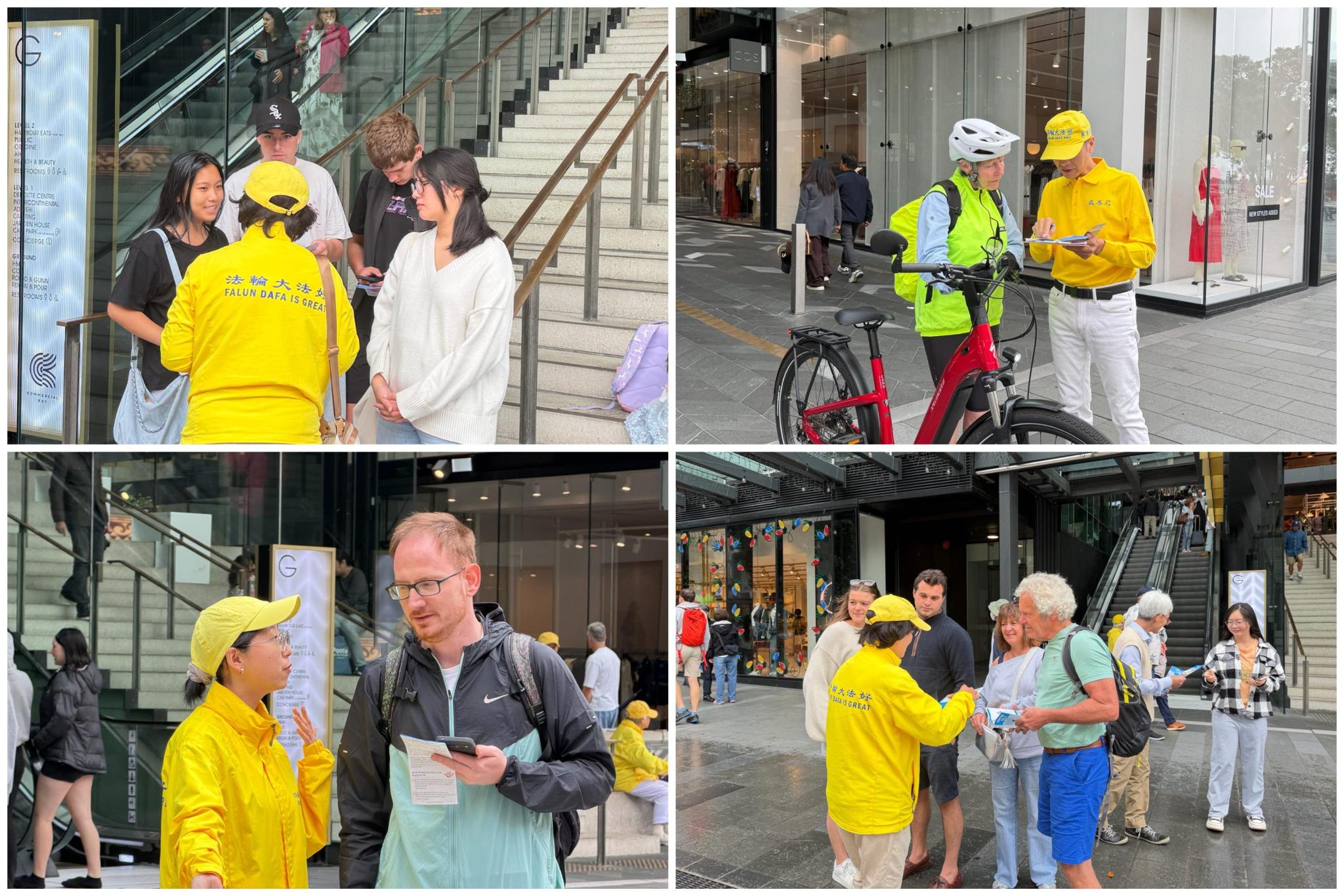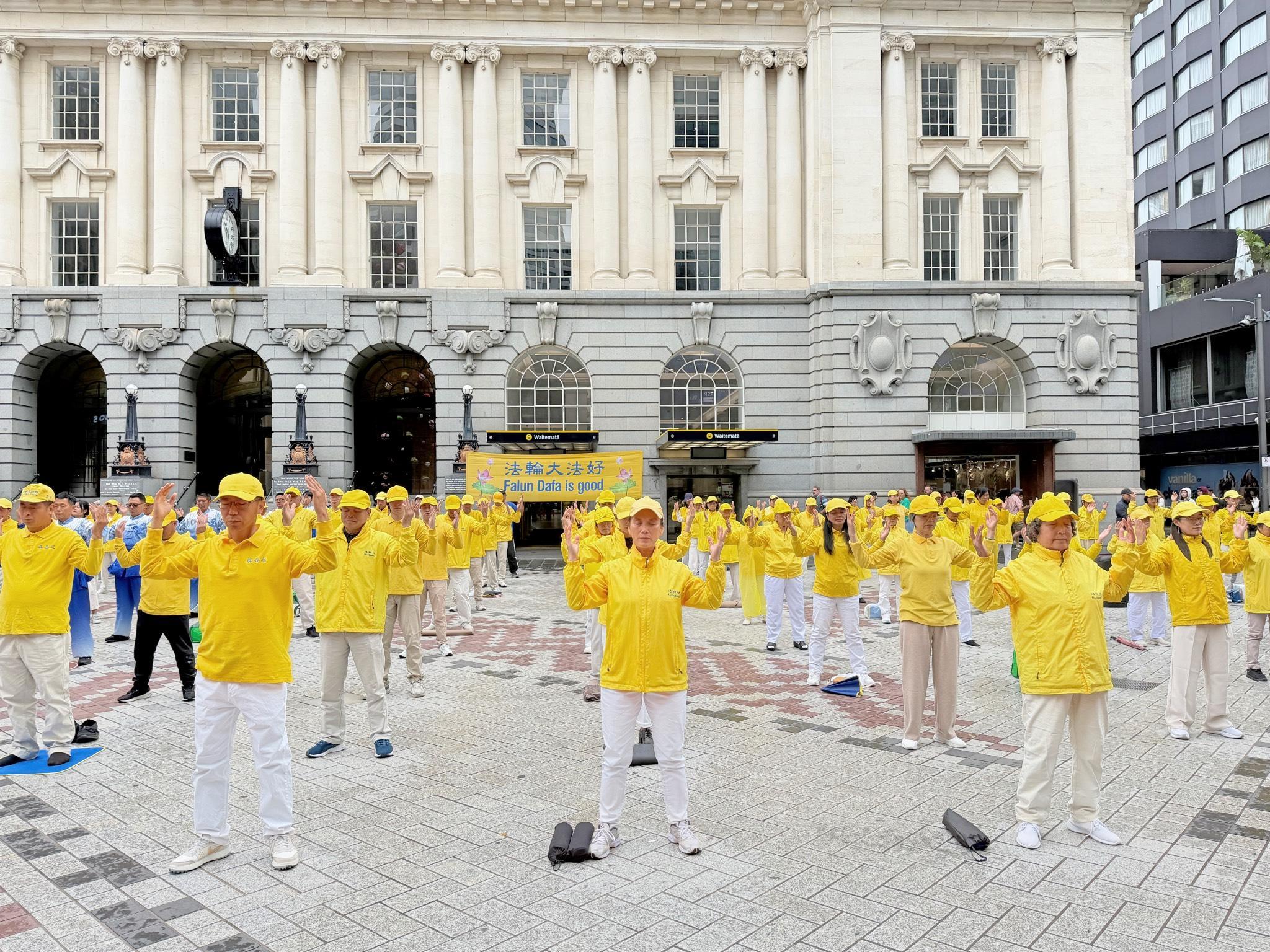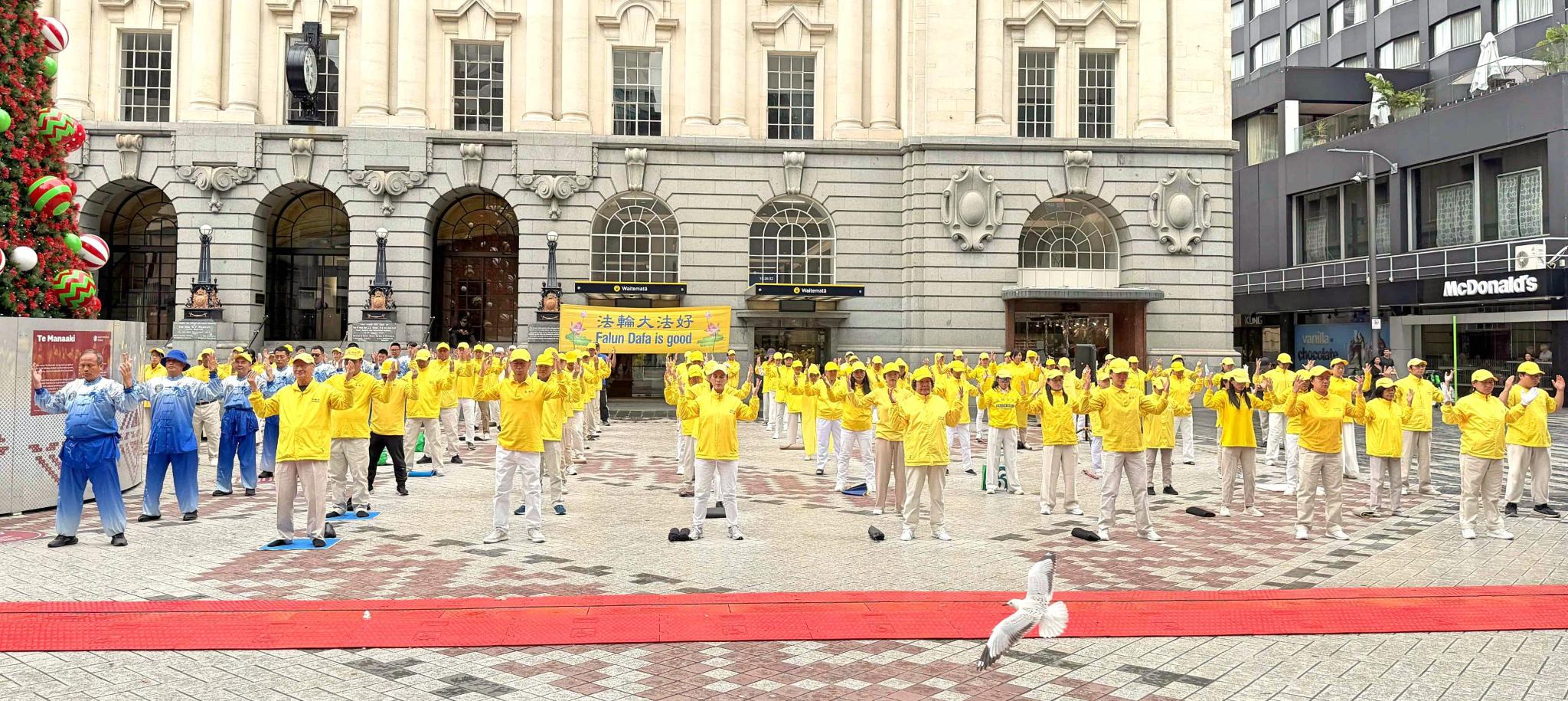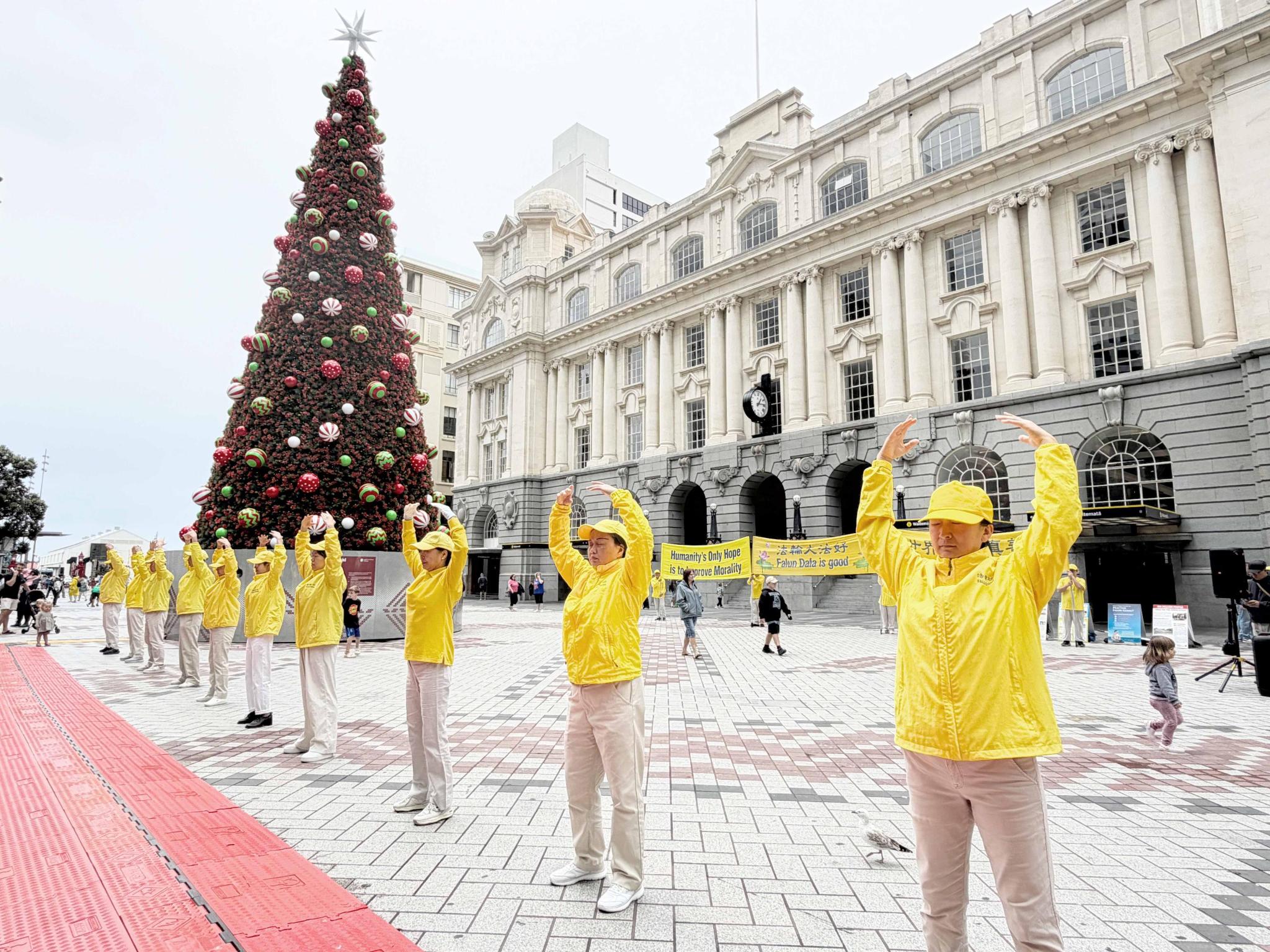 【明慧網二零二五年十二月三十日】(明慧新西蘭記者站報導)二零二五年十二月二十七日星期六,新西蘭法輪功學員在奧克蘭市中心商業灣(Commercial Bay)廣場煉功、講真相,並慶祝即將到來的新年。他們在人流不息的廣場設立了真相台,展示五套功法、義務教功。由法輪功學員組成的舞龍隊還表演了節目,受到了人們的歡迎。人權律師凱瑞﹒高爾(Kerry Gore)到場演講支持,他讚賞法輪功學員多年來一直堅持真理,勇敢抗爭,並呼籲新西蘭社會各界幫助法輪功學員反對中共的迫害。