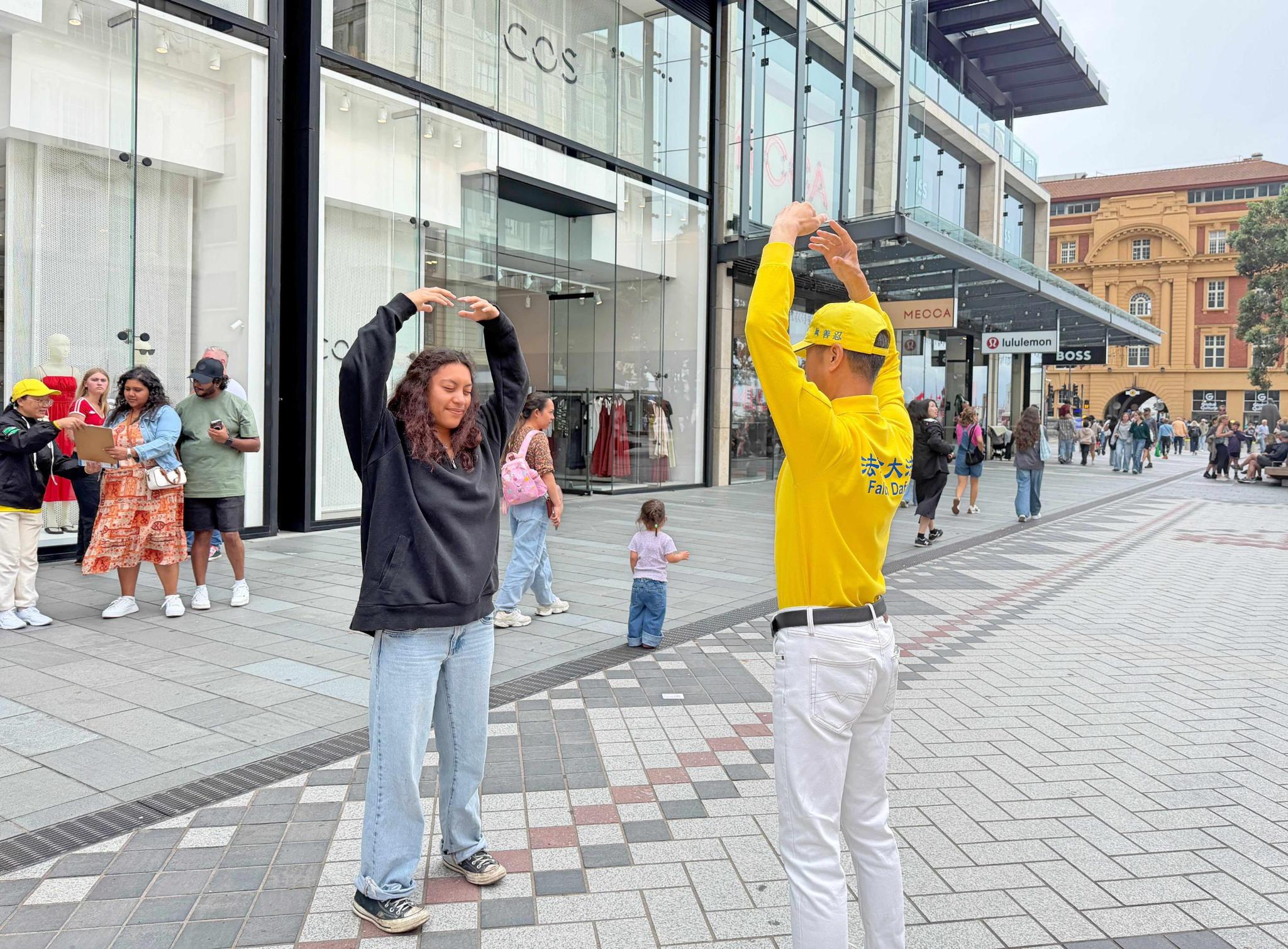來自奧克蘭南區普基科希(Pukekohe)的安妮─瑪麗(Anne-Marie)表示,這是她第一次看到法輪功功法展示。「以前從沒聽說過,但看到他們煉功,就很想了解,看看這是怎麼回事。」