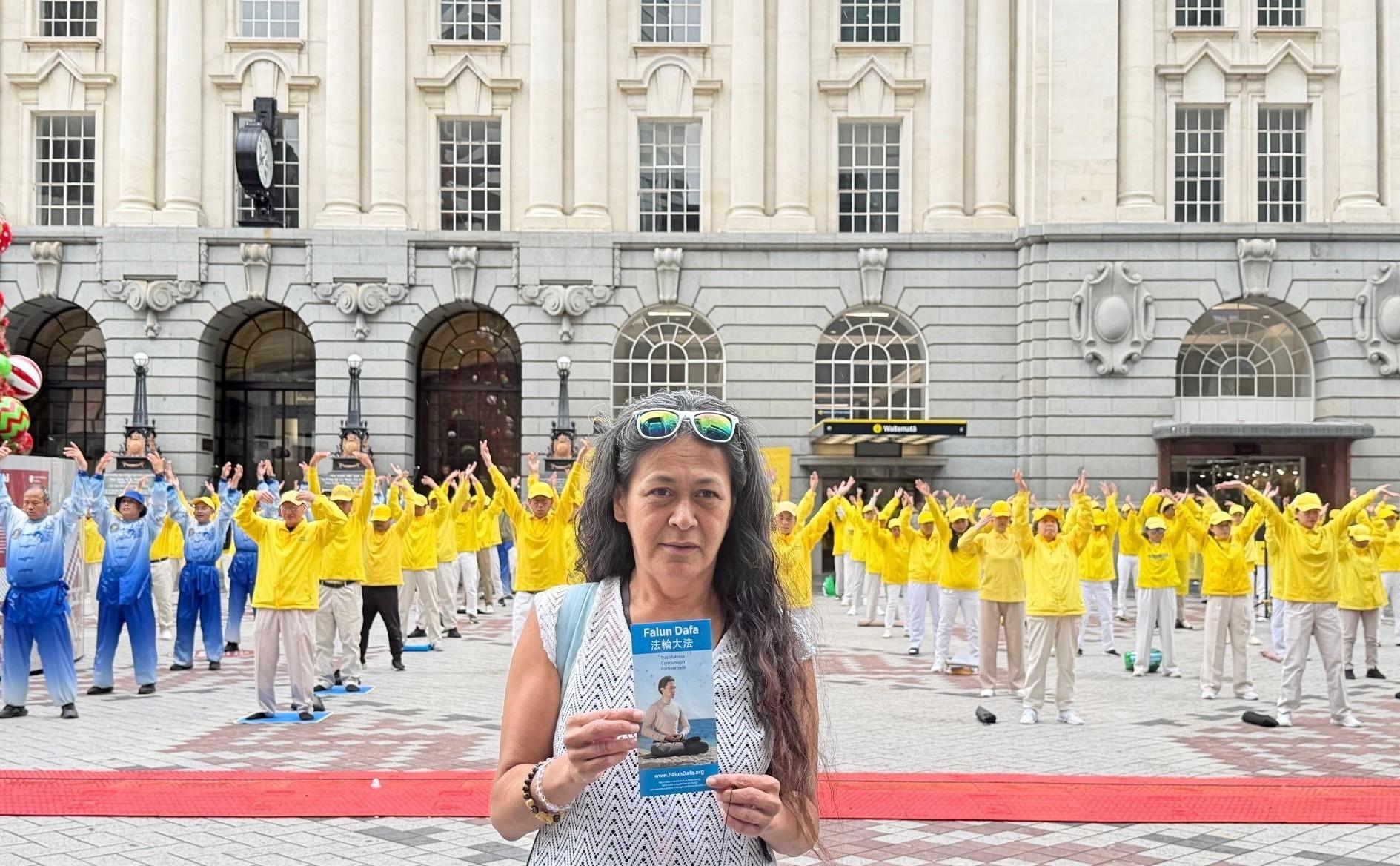 沙凱拉還說,最初遠遠看到身著黃色服裝的煉功者時,還以為是一種抗議活動或舞蹈表演,走近後才發現是打坐煉功,「那一刻讓人感到很特別」。她認為,集體煉功所呈現出的祥和畫面,能幫助人們重新找到與內在、與更高精神層面的連接。