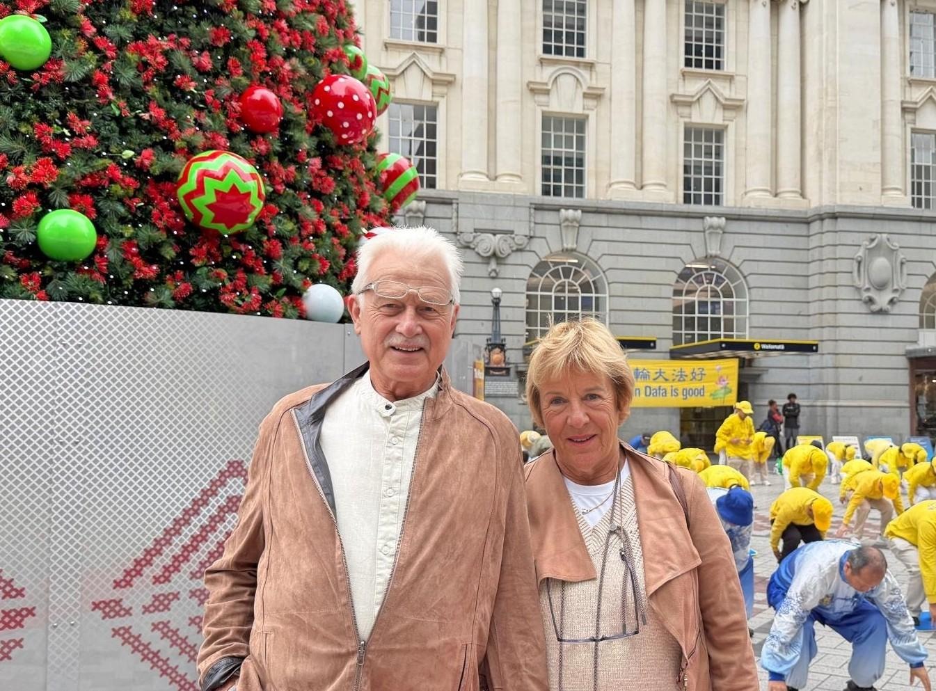 圖10:西格麗德(Sigrid)與丈夫羅蘭(Roland)被法輪功學員煉功場面吸引。