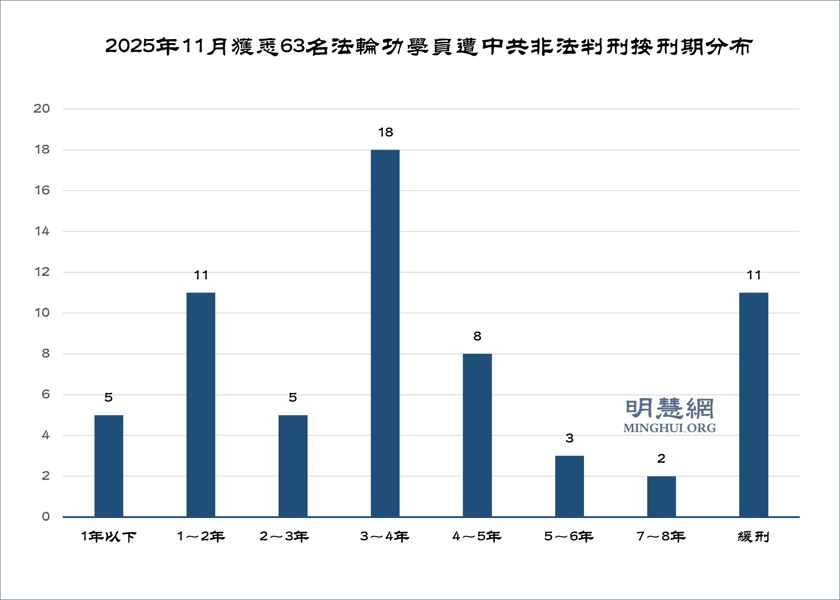 圖2:2025年11月獲悉63名法輪功學員遭中共非法判刑按刑期分布