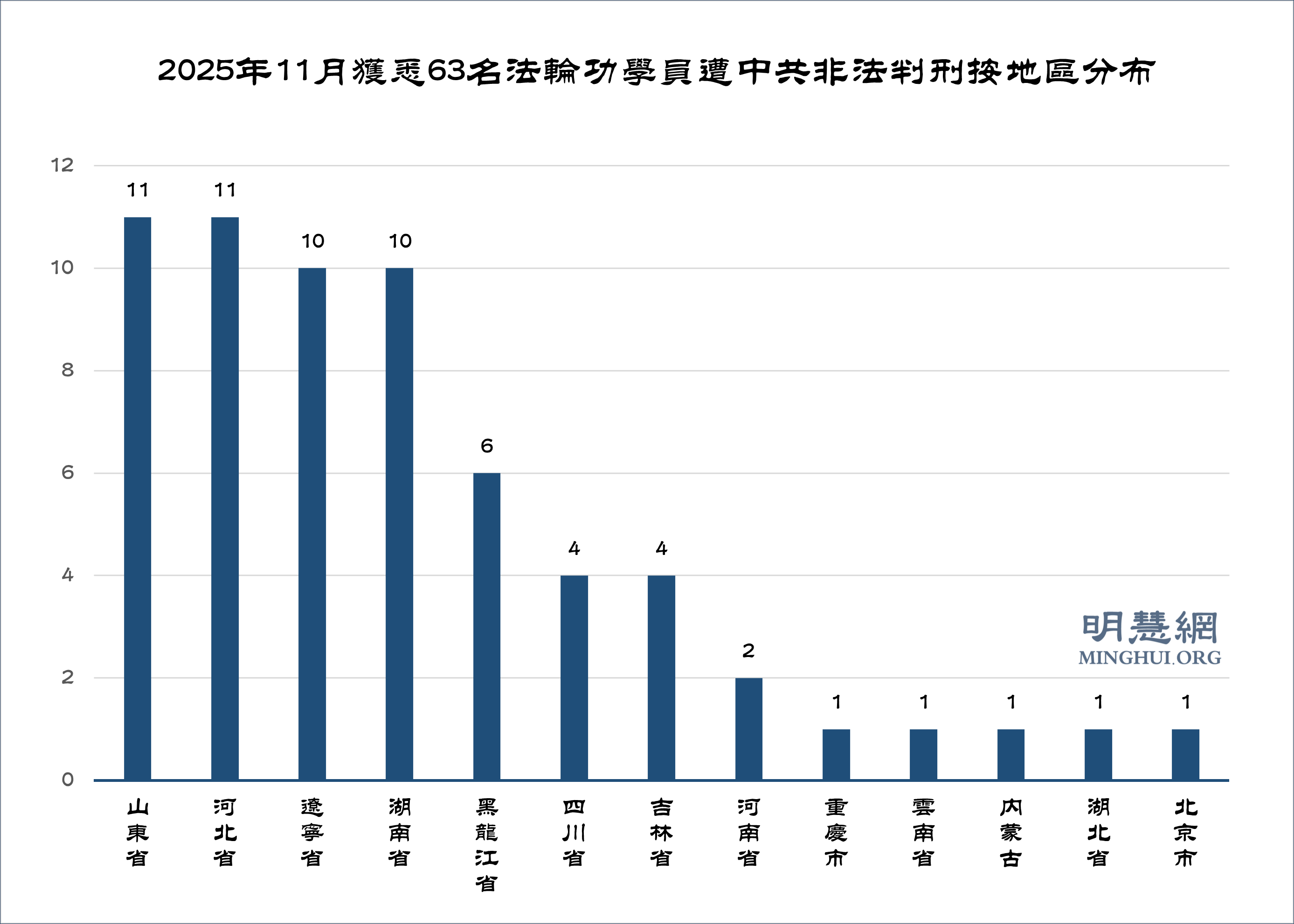 【明慧網二零二五年十二月六日】(明慧網通訊員綜合報導)據明慧網報導統計,二零二五年十一月份明慧網獲知,至少又有63名法輪功學員遭中共非法判刑(其中,2025年57 人,其他年份6人)。非法判刑最長者85歲,最年輕者43歲。非法刑期最長的7年,最短的6個月。其中,40~50歲 1人,50~60歲7人,60~70歲15人,70~80歲8人,80~90歲1人。非法判三年以上刑期的31人。十一月份中共法庭勒索法輪功學員罰金約 199500元。