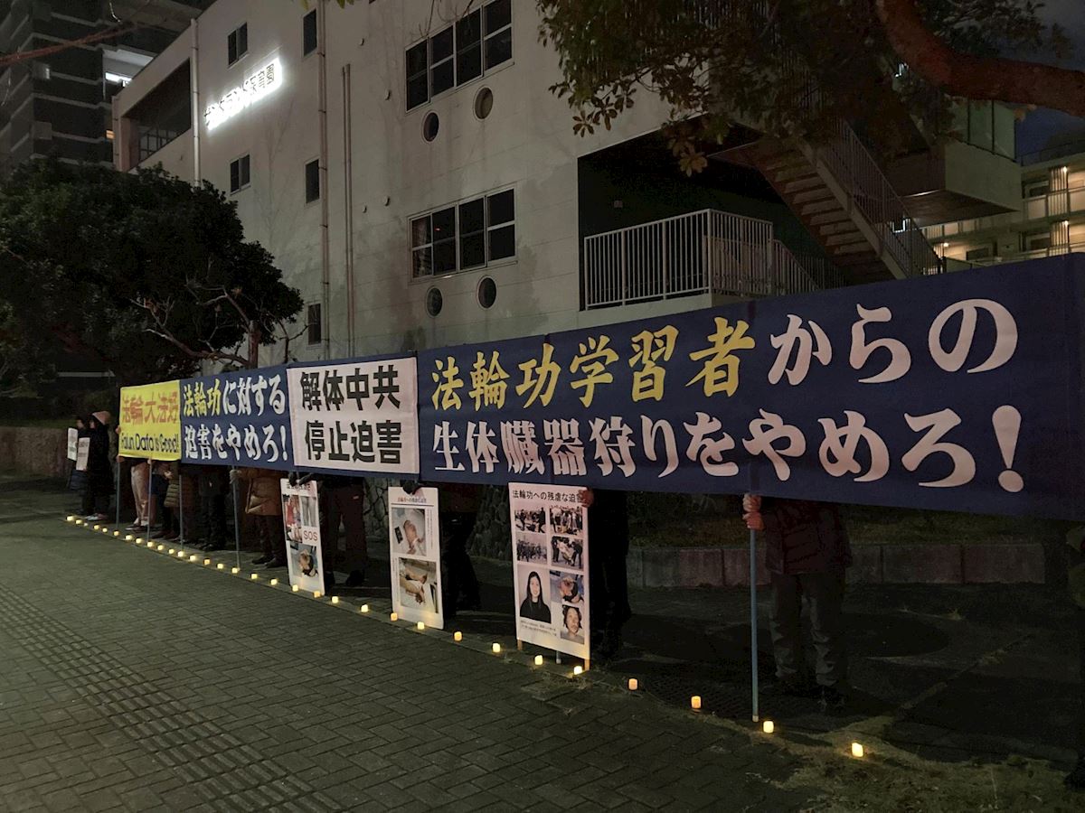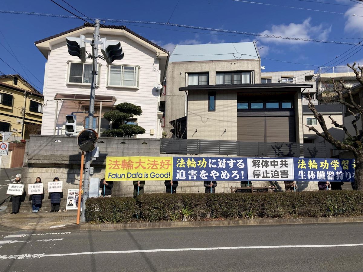 學員們整齊地展示多條中日文橫幅與真相展板,上面寫有「法輪大法好」「立即停止對法輪功的迫害」「立即停止對法輪功學員的活摘器官」「還法輪功自由」「STOP!對法輪功的迫害」「善惡必報」「STOP!活摘器官」等醒目標語,強烈譴責中共對法輪功迫害。