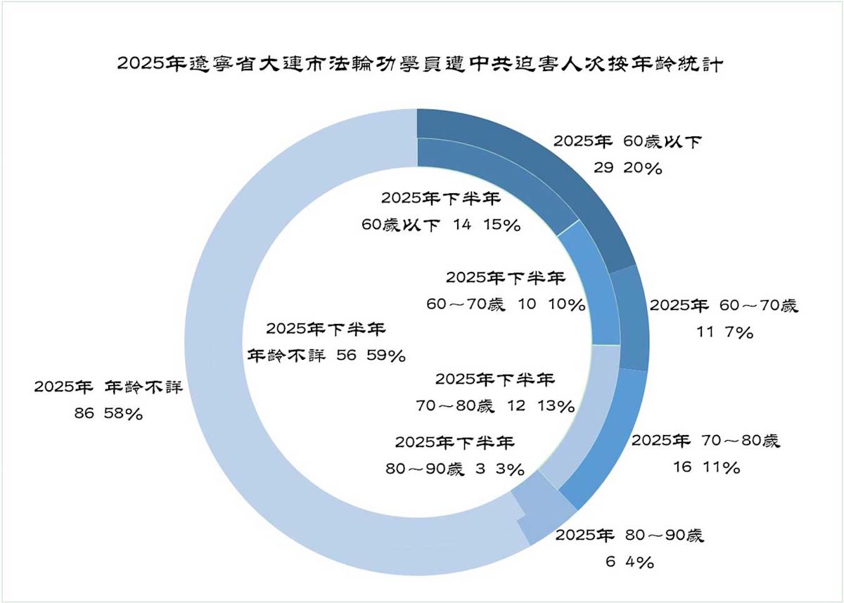 2、二零二五年下半年大連市法輪功學員遭中共迫害,60歲以下的14人次,佔15%;60歲以上的25人次,佔26%,其中60~70歲10人次,70~80歲12人次,80~90歲3人次;年齡不詳者56人次,佔59%;年齡最長者80多歲。二零二五年大連市法輪功學員遭中共迫害,60歲以下的29人次,佔20%;60歲以上的33人次,佔22%,其中60~70歲11人次,70~80歲16人次,80~90歲6人次;年齡不詳者86人次,佔58%。見圖3。