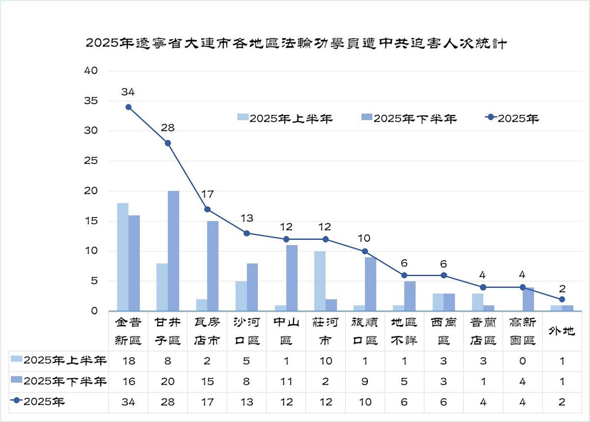 ![]() 圖1:2025年遼寧省大連市法輪功學員遭中共迫害人次統計 |