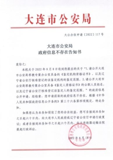 ![]() 《大連市公安局政府信息不存在告知書》 |