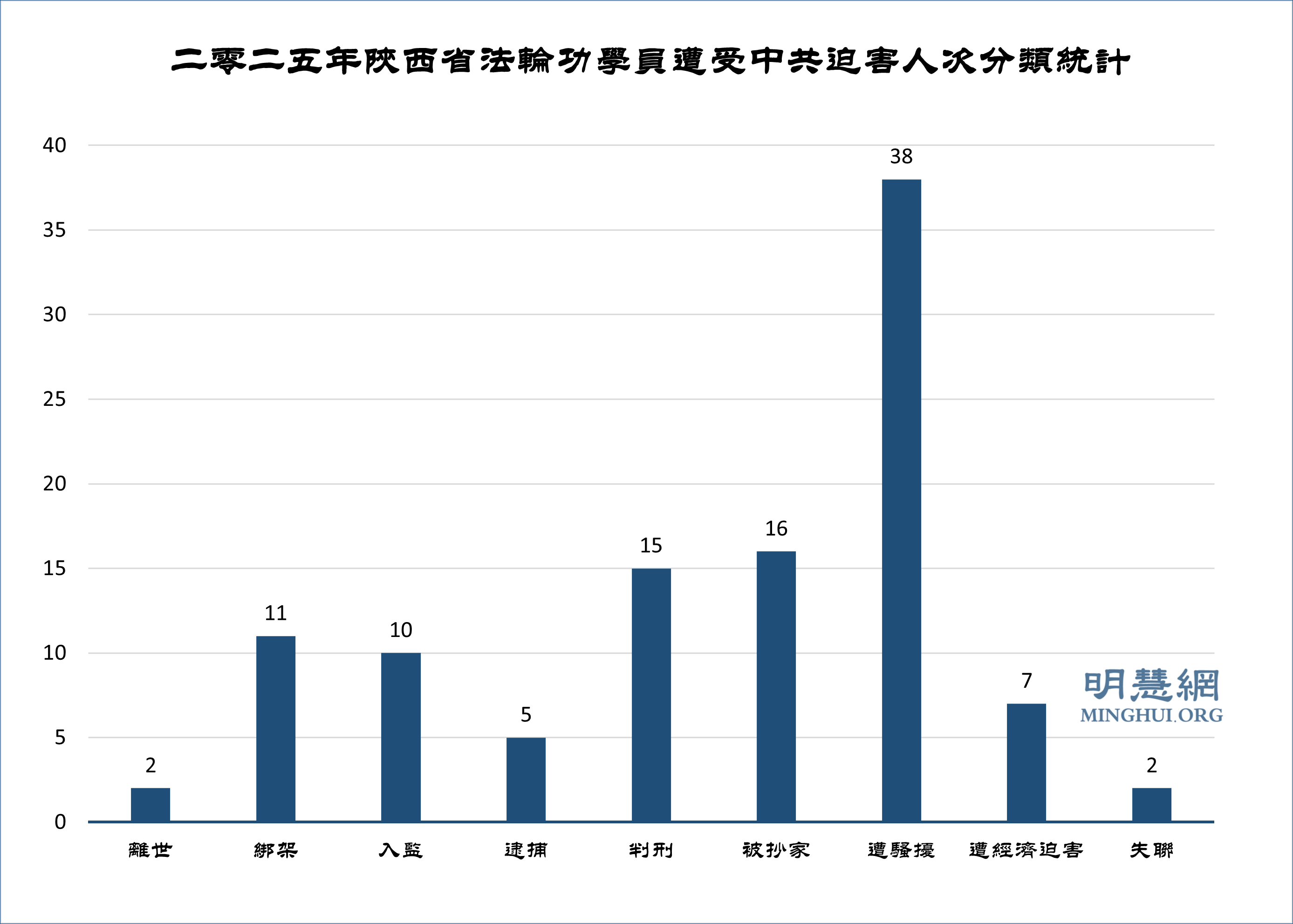 ![]() 圖2:二零二五年陝西省法輪功學員遭受中共迫害人次分類統計 |