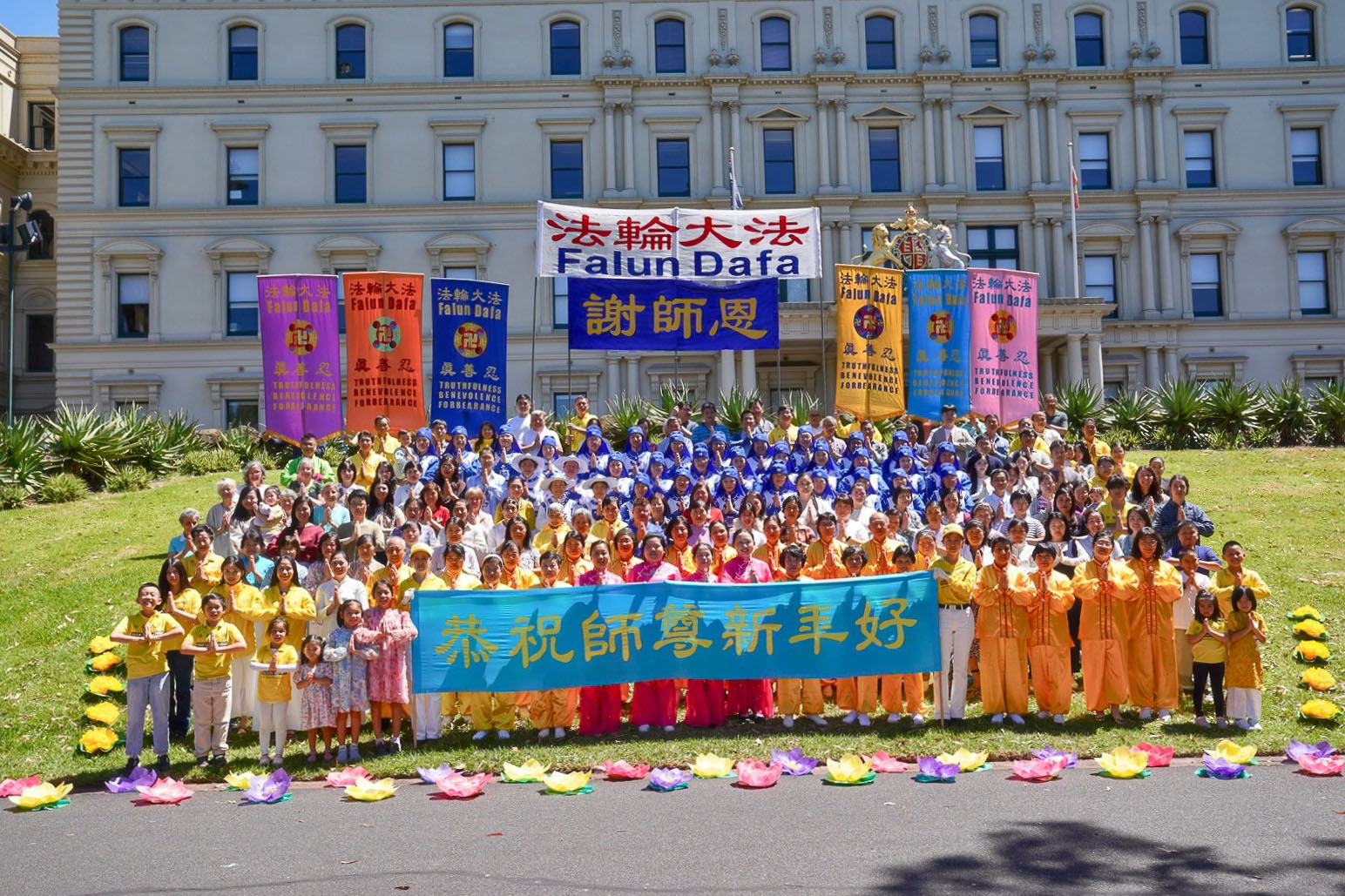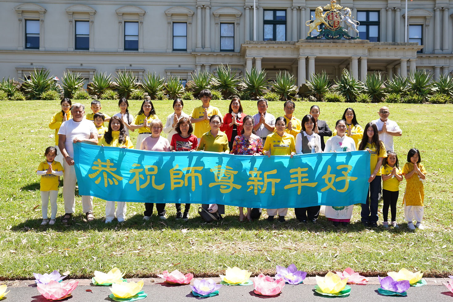 ![]() 圖1:墨爾本部份法輪功學員在市中心的財政花園(Treasury Gardens)拍攝合照,恭祝李洪志師父過年好。 |