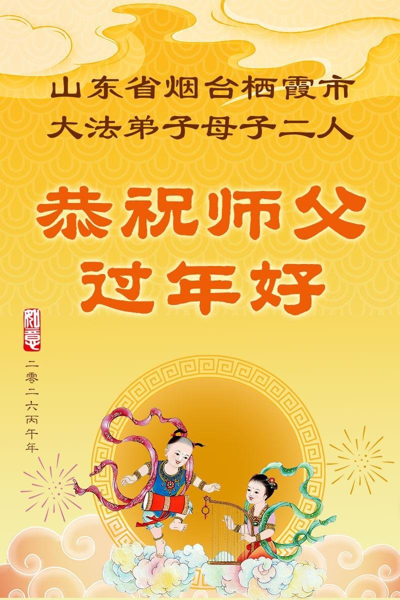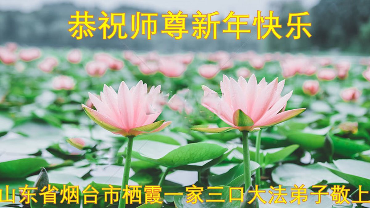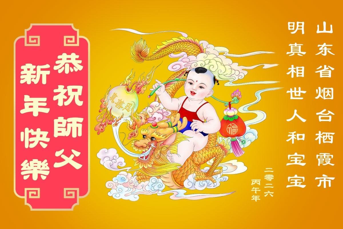 山東省煙台市招遠市明真相的一家三口人祝大法師父新年快樂!