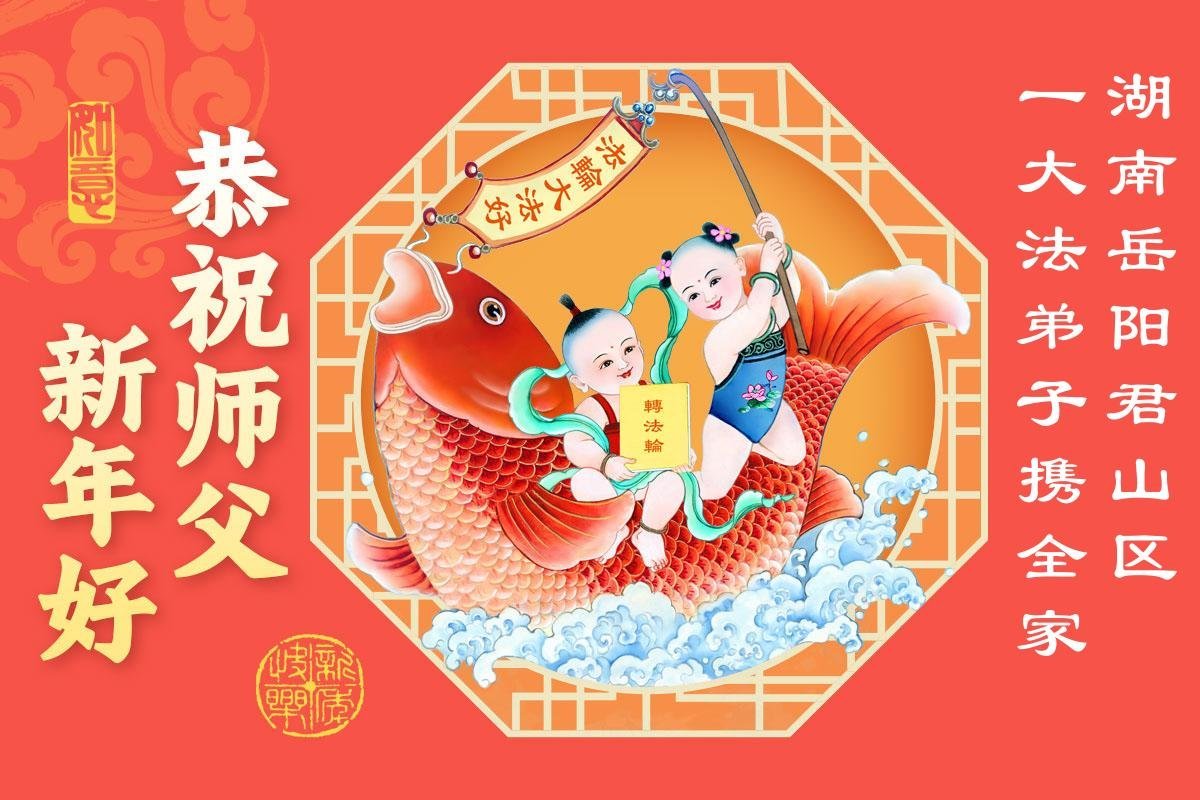 湖南岳陽君山區一大法弟子攜全家恭祝師尊新年快樂!