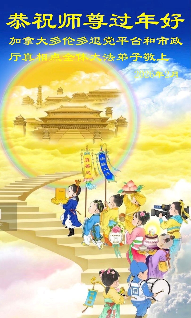 大法師父您辛苦了!我們經常念「法輪大法好、真善忍好」。一大家十多個小家庭共四十多人都受益於大法,日子平平安安,喜樂幸福。謝謝大法師父!多倫多太古真相點 持之以恆喚醒華人