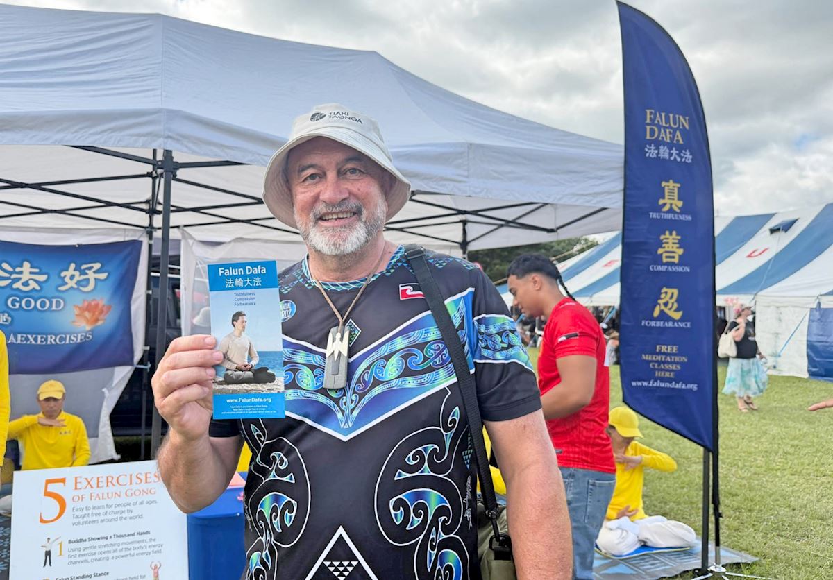 來自新西蘭查塔姆群島(Chatham Island)的毛利律師毛伊﹒所羅門(Maui Solomon)在展位前停留良久。他表示,自己近一年來開始接觸冥想,希望通過向內的修煉,重新認識自我,與世界建立更和睦的關係。他表示他想學習法輪功,並諮詢了在網上自學的方法。