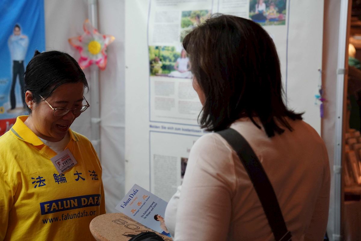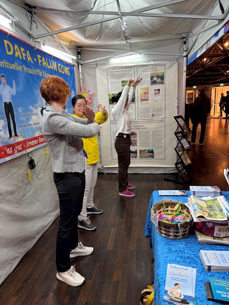 許多參觀者經過展位,對功法表現出濃厚興趣,停下腳步看功法演示。通過展位上的介紹,很多人了解了甚麼是法輪功。不少人現場購買了法輪功的主要著作《轉法輪》。