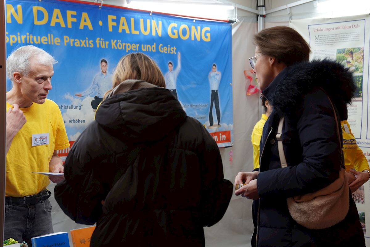 【明慧網二零二六年三月二日】二零二六年二月二十一日和二十二日,德國弗蘭肯地區(Franken)的法輪功學員在菲爾特舉辦的健康博覽會上向參觀者介紹了佛家修煉功法──法輪功。此次展會共有80家提供健康與療愈諮詢的展位。法輪功學員們在展位上展示了功法,並介紹法輪功。此外,法輪功學員也在舞台上為觀眾演示了五套祥和的功法。