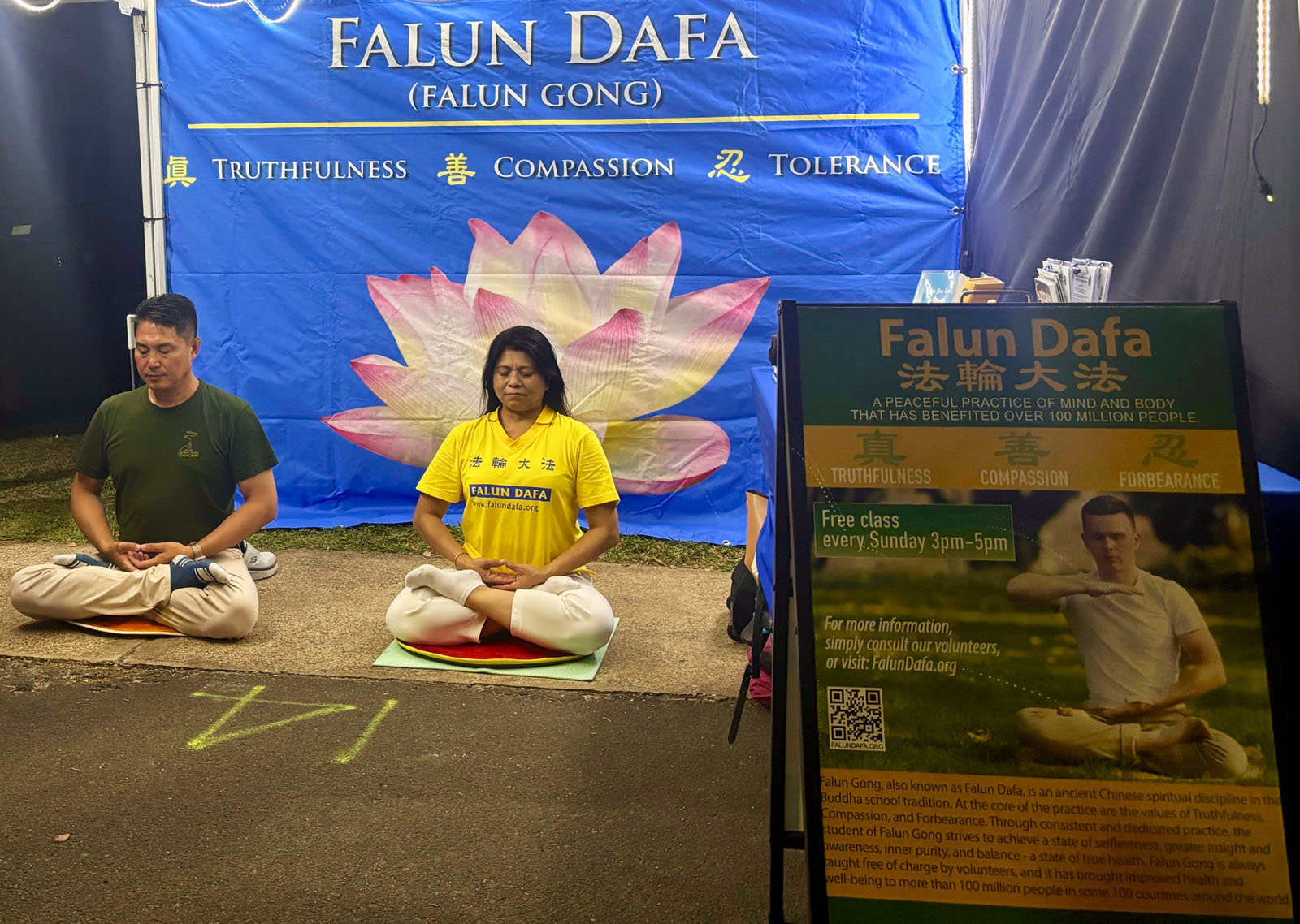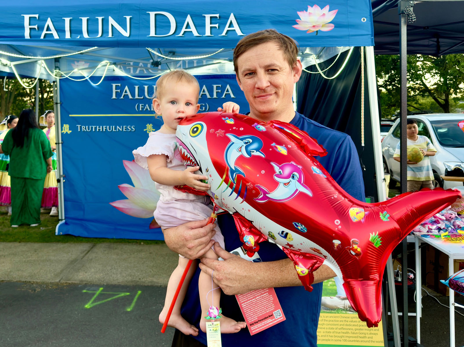 大量參觀者了解法輪功的信息後,對每週二晚間的線上教功班感興趣。也有許多人詢問了當地煉功的地址,希望去學功。印有「法輪大法好」的真相小蓮花也深受大家的喜愛。