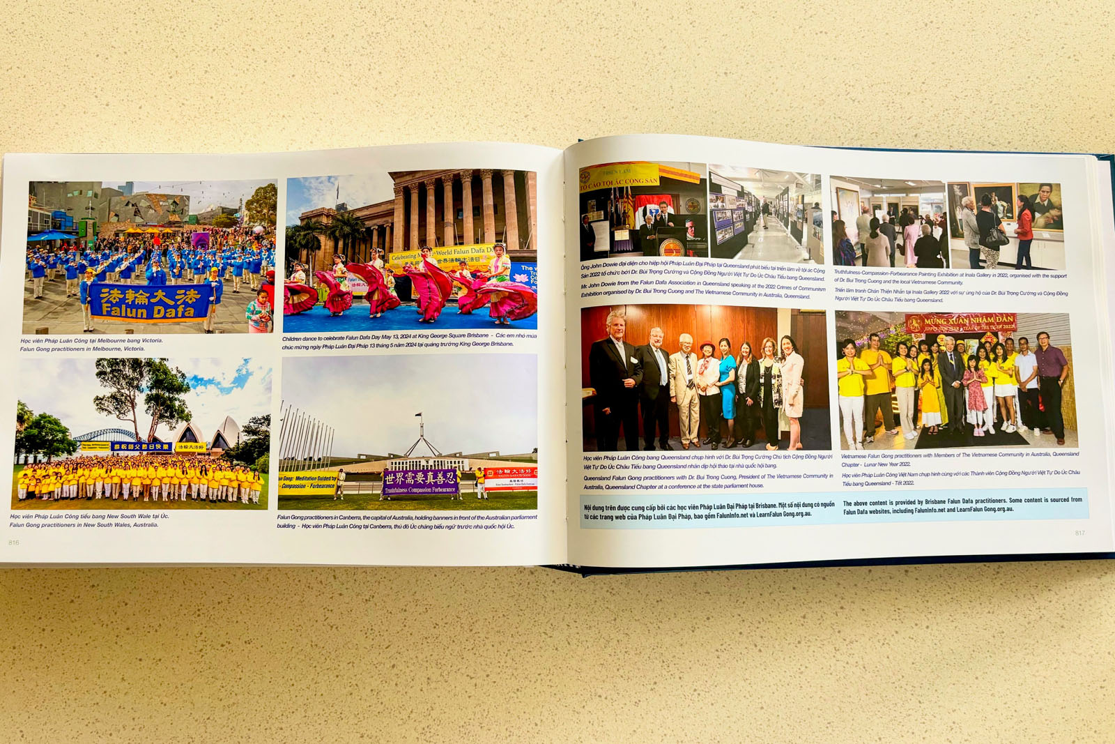 「越南社區50週年」書中還加入了不少法輪功的照片和信息,對此阮先生還表示:「加入這些信息,是表達我們越南社區對法輪功的支持。因為我們有相同的信念,經歷過相同的事情。法輪功受到中共迫害,我們越南移民也曾經受到過共產主義的迫害,因此我們逃離越南,來到澳洲這片自由的土地。平穩、自由、尊重是澳洲的價值觀,我們理所當然的應該支持法輪功。」