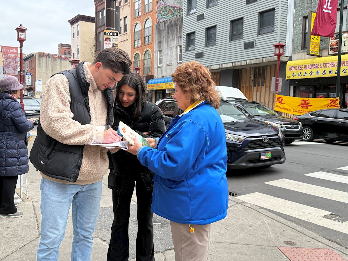 ![]() 圖3~4:二零二六年四月二十六日,大費城地區部份法輪功學員在費城華埠舉行集會,以紀念4.25和平上訪二十七週年。法輪功學員向民眾發放真相傳單、講真相,並為《法輪功與活摘器官受害者保護法案》向民眾徵集簽名。 |