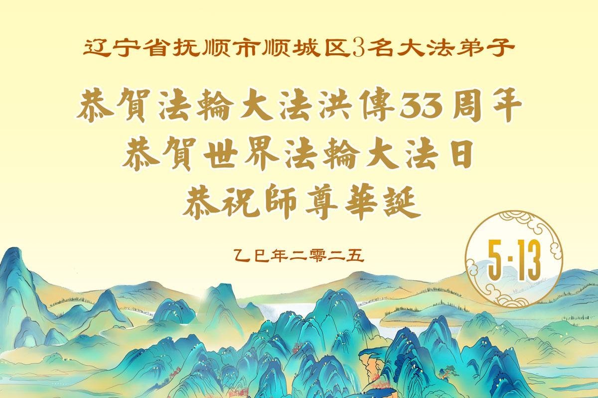 遼寧省撫順市順城區3名大法弟子恭賀世界法輪大法日暨敬祝師尊華誕!