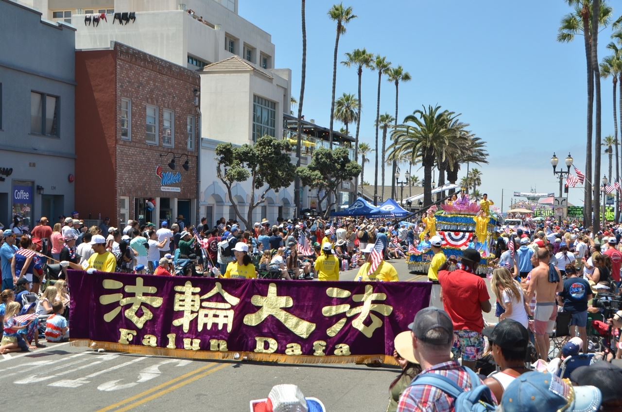 ![]() 圖1:二零二三年七月四日,杭廷頓海灘市獨立日遊行中,法輪功學員的隊伍。 |