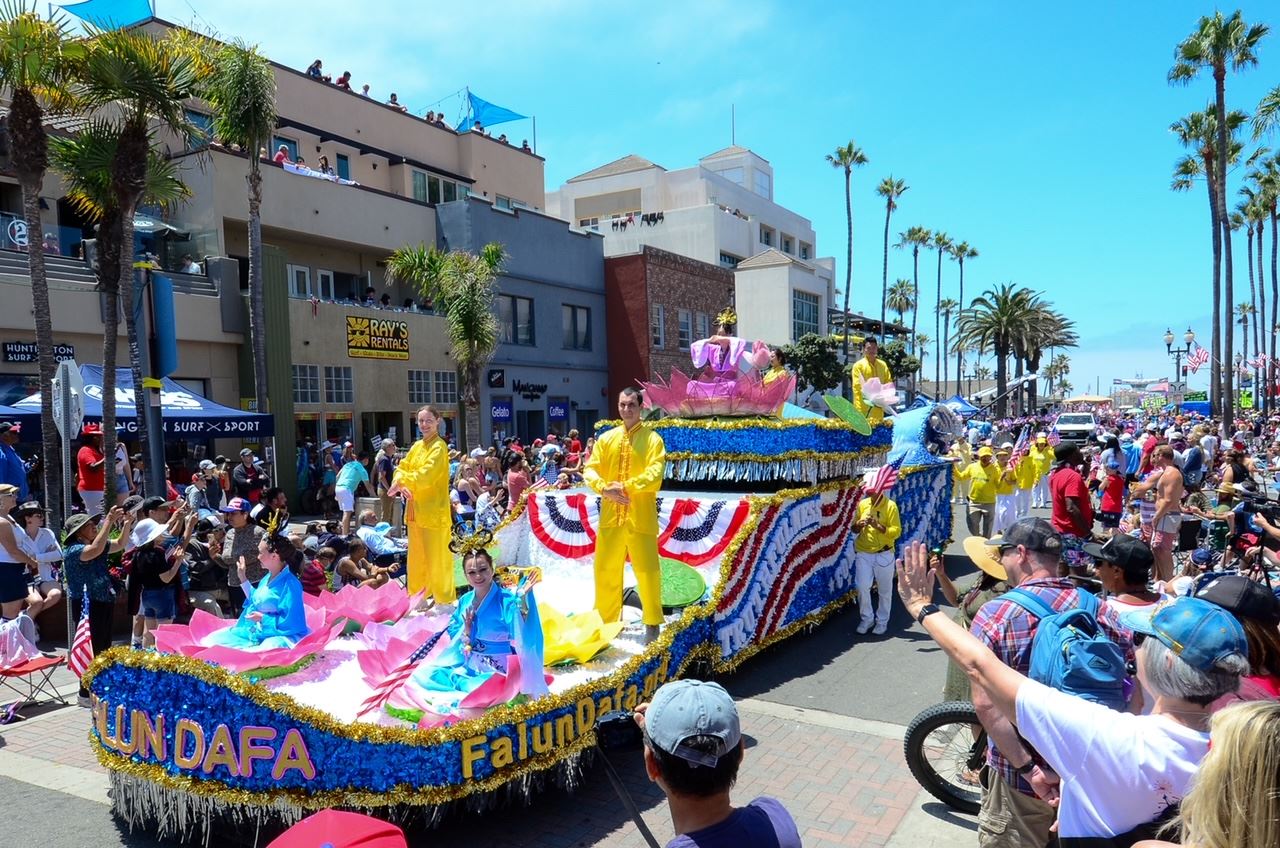 ![]() 圖2:二零二三年七月四日杭廷頓海灘市獨立日遊行中,法輪功學員的花車。 |