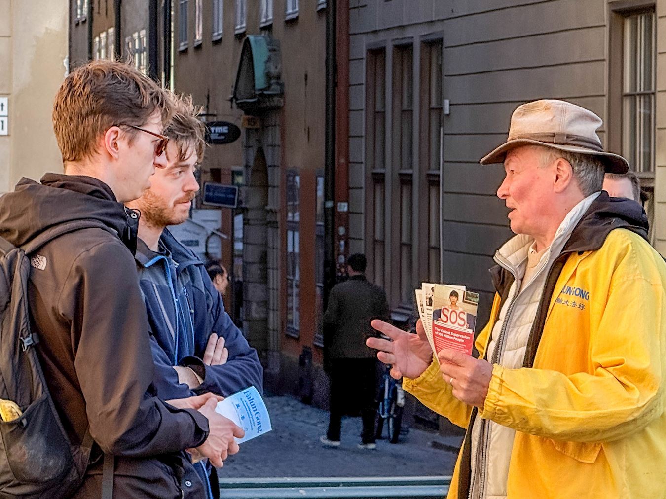 在活動現場,一位瑞典先生看到遊人絡繹不絕地前來簽名聲援法輪功,就徑直走上前和學員聊了起來。他介紹自己是瑞典的一名記者,並告訴學員他很清楚中共活摘器官這個事情是真實存在的。