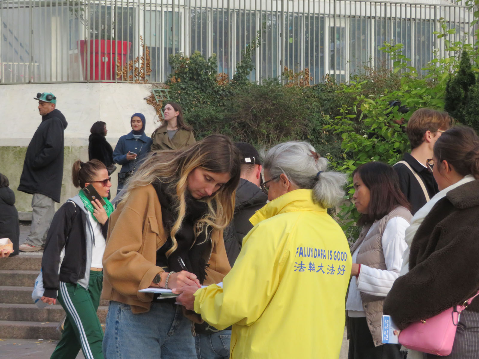 阿婭(Aya)是公共工程領域的研究生。這天她與父親塔烏菲克(Taoufik)一同來到法輪功活動地點。阿婭認為法輪功修煉對任何人都沒有傷害。那為甚麼要有迫害發生呢?她表示,信仰是每個人自己的事。