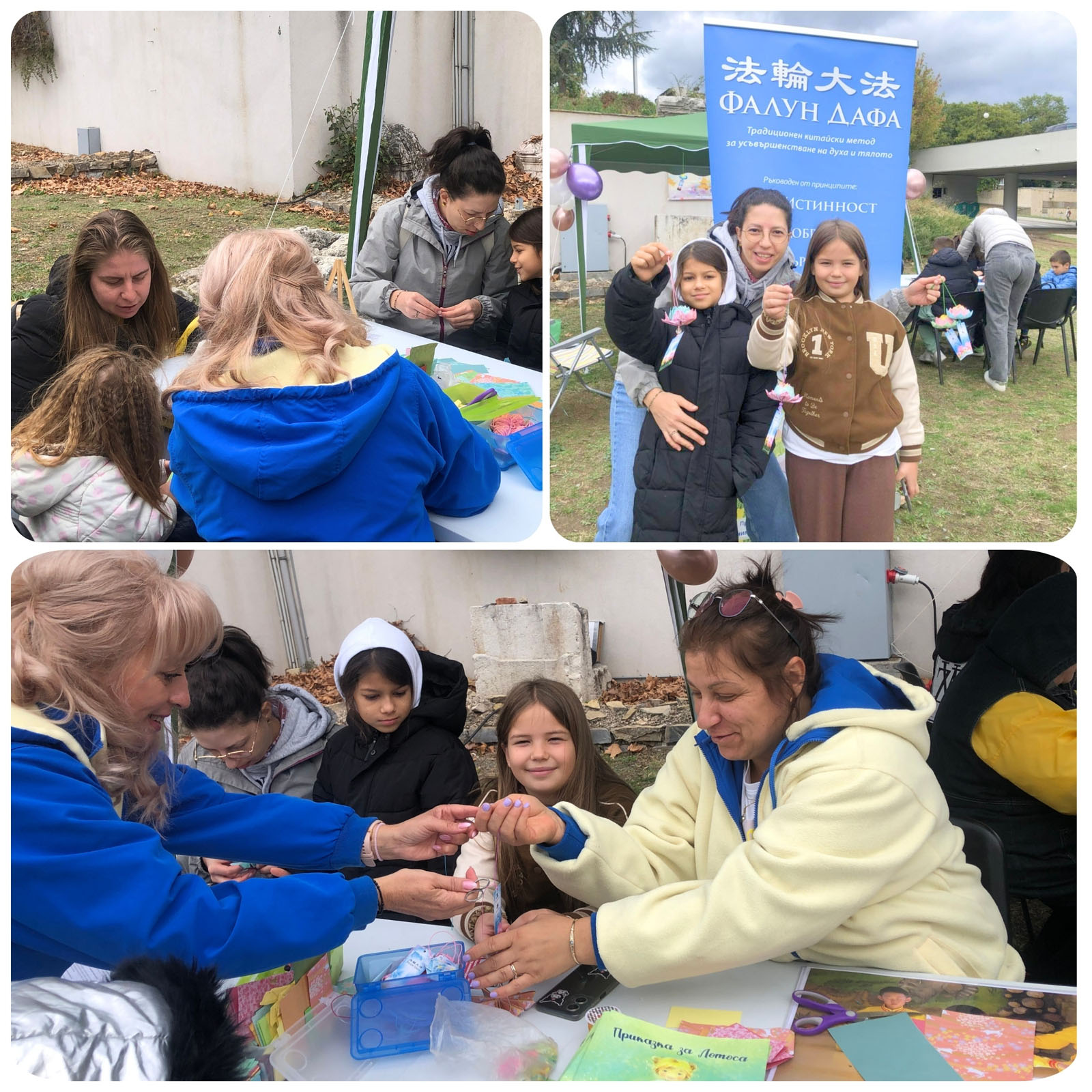 學員們分發介紹法輪大法及其遭受中共迫害的真相傳單,與人們交談,折蓮花,並煉功。蓮花工作坊除了為孩子們提供有趣的活動外,法輪功學員也告訴孩子們真、善、忍價值觀。孩子們在摺紙蓮花時,學員給他們講《蓮花的故事》,這是一本由法輪功學員編寫的兒童讀物,旨在教導孩子們在生活中遵循真、善、忍原則。
