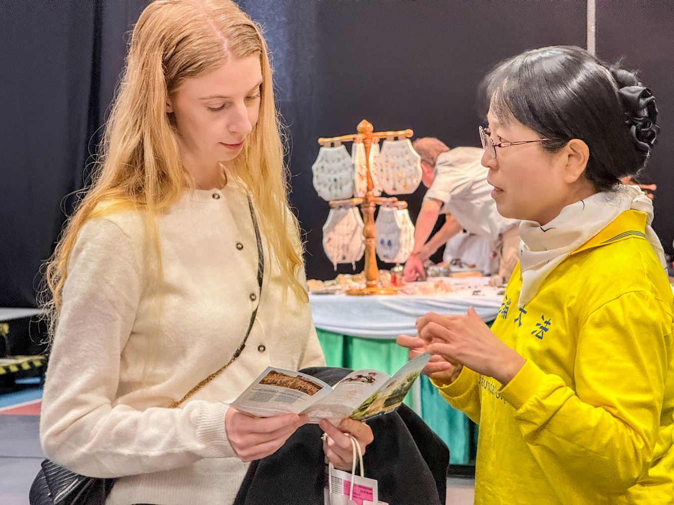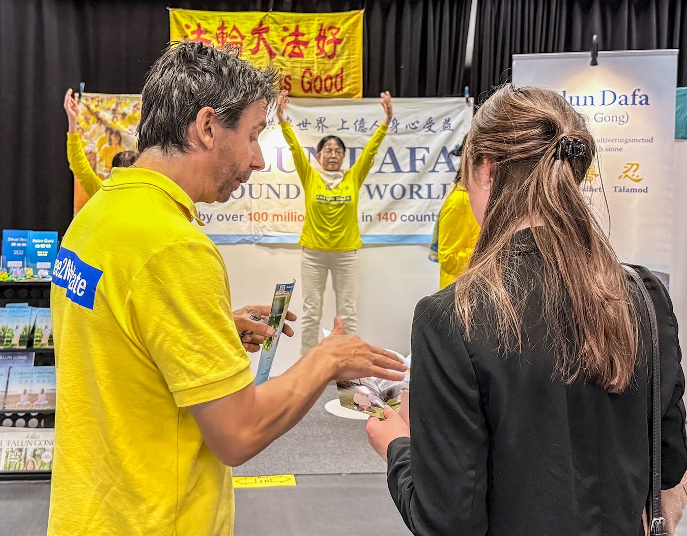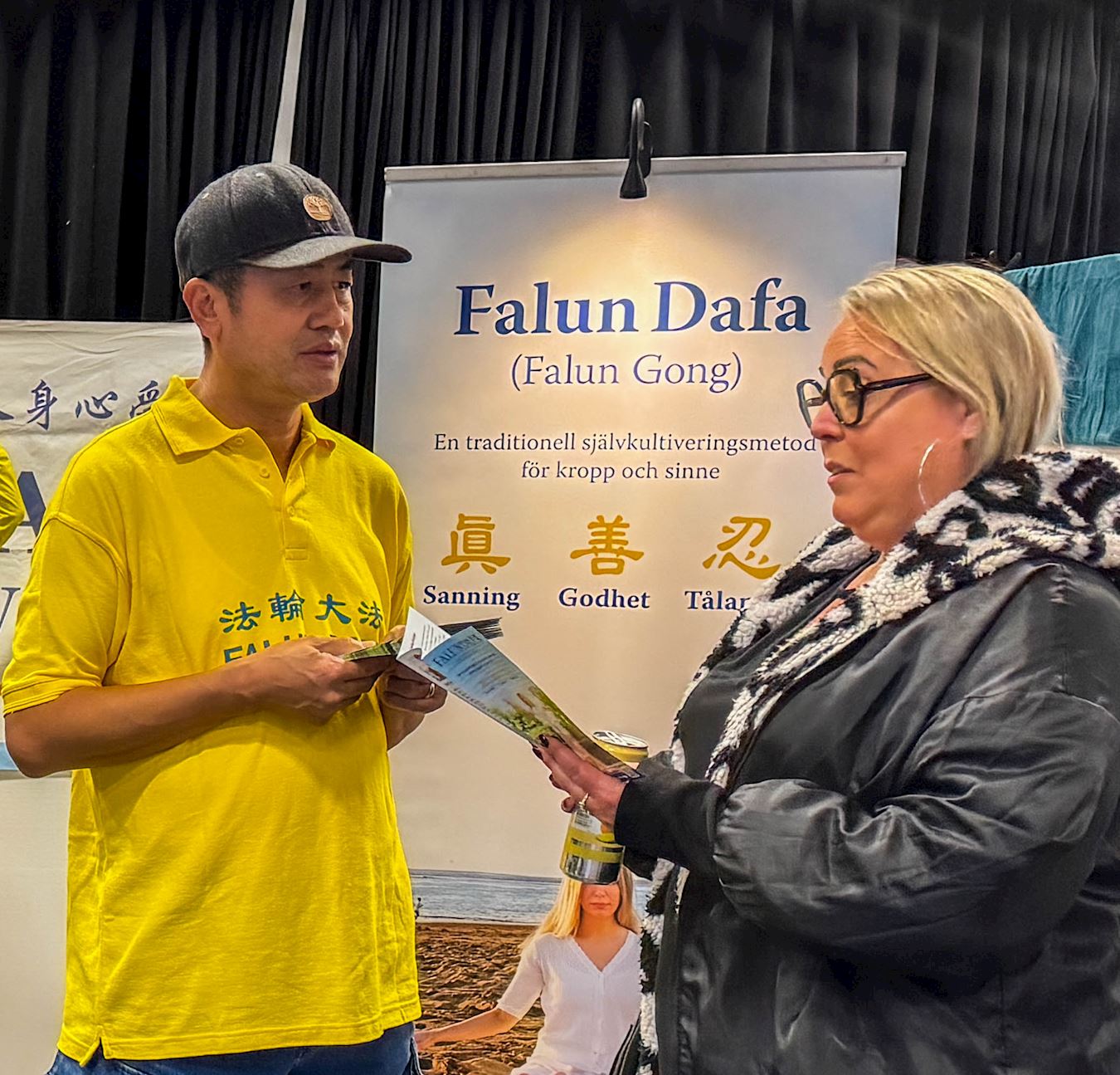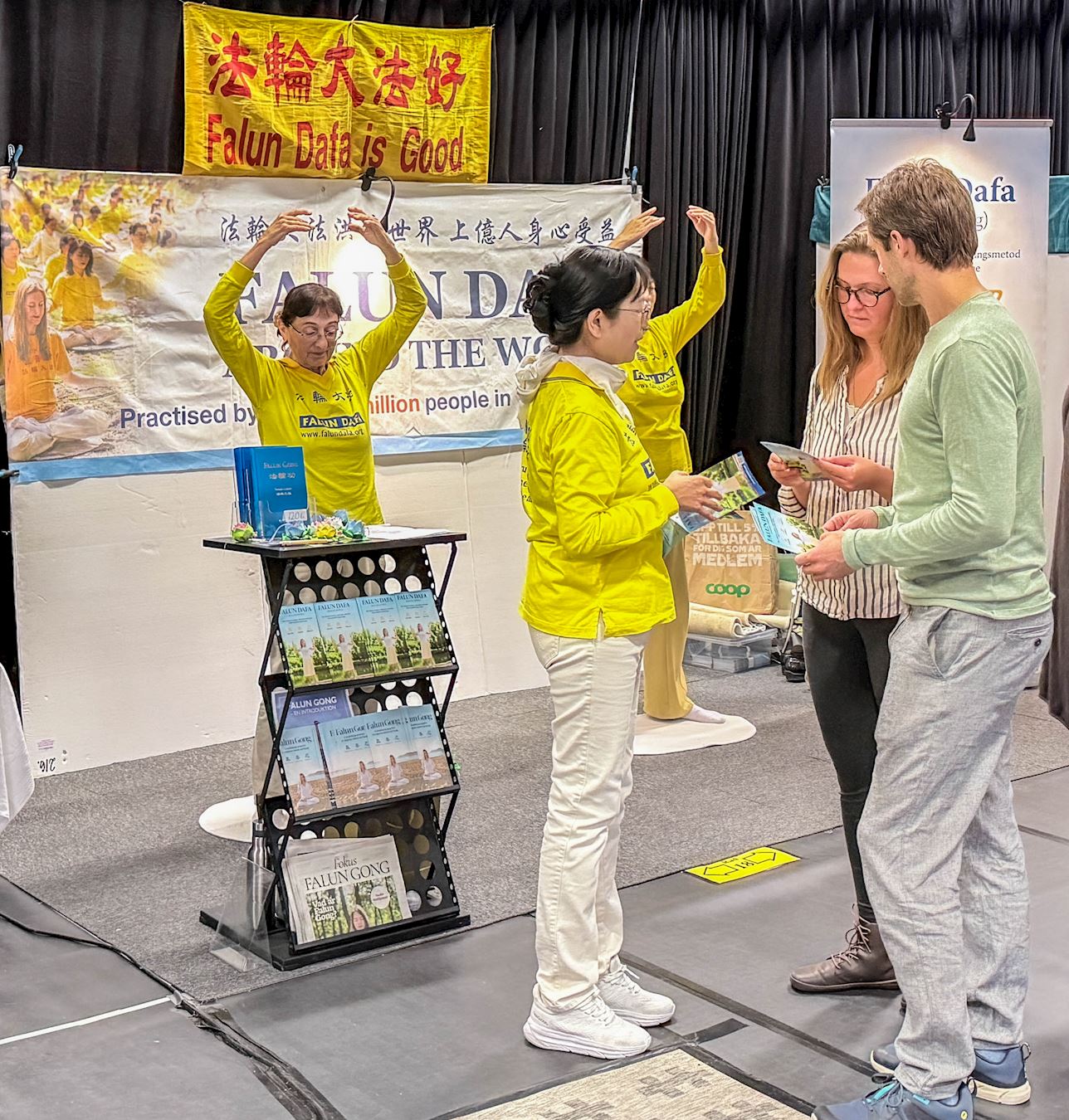 兩天展會期間,很多參觀者在與學員的交談中了解到法輪大法是由李洪志先生於一九九二年五月在中國傳出的佛家上乘修煉大法,指導修煉者以真、善、忍為原則提升道德與身體健康,至今已弘傳一百多個國家,法輪功的主要著作《轉法輪》已被譯成五十種語言,獲褒獎、支持決議案和信函逾萬項。聽了學員的介紹,人們對法輪功真、善、忍的普世價值表示認同,來展台購買法輪功書籍的有緣人絡繹不絕。來自瑞典北部一位年輕女士就是其中的一個。