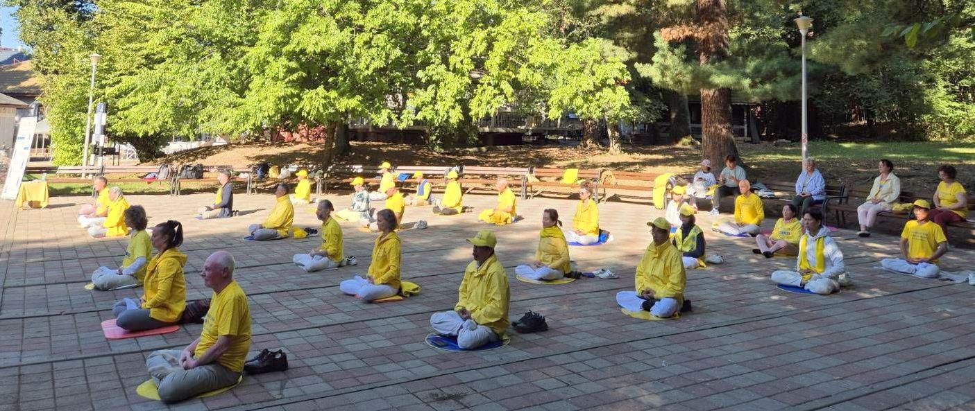 這是法輪功學員繼二零一九年和二零二二年之後第三次參加栗子節,也是他們第一次參加遊行。法輪功學員還在遊行隊伍中展示功法。