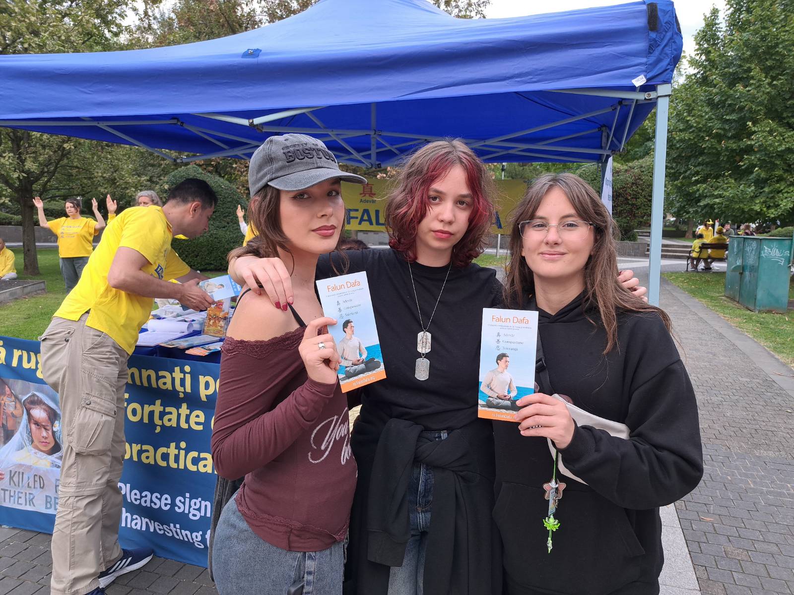 十二年級的學生弗洛麗娜(Florina ,左)、尤利婭(Iulia)和阿內莉絲(Anelise)閱讀了傳單並在請願書上簽名。學員向她們詳細介紹中共活摘器官的殘酷迫害。當了解到法輪功學員如何遭受迫害、毆打和酷刑,以及他們如何被活摘器官,弗洛麗娜流下了眼淚。