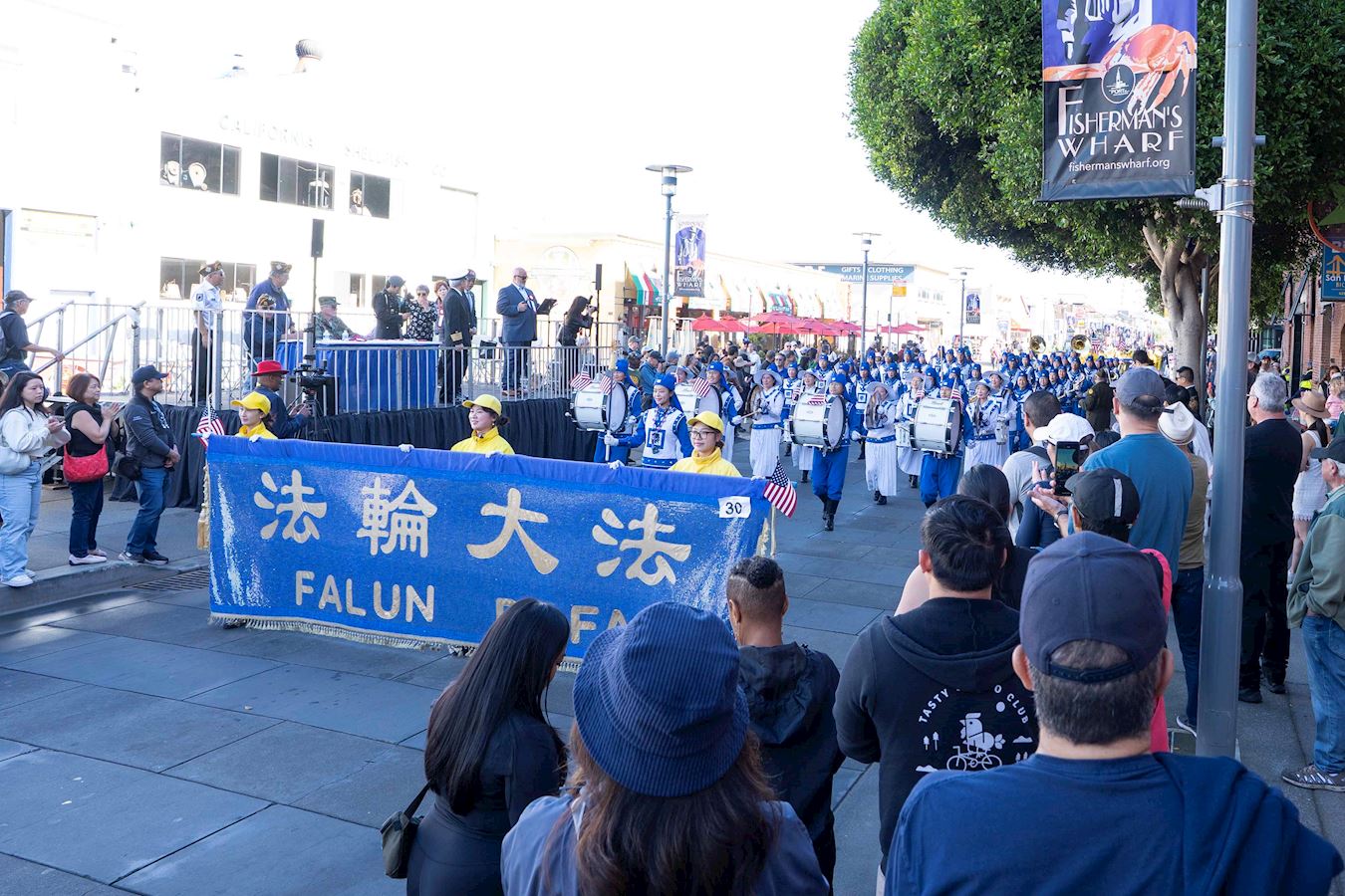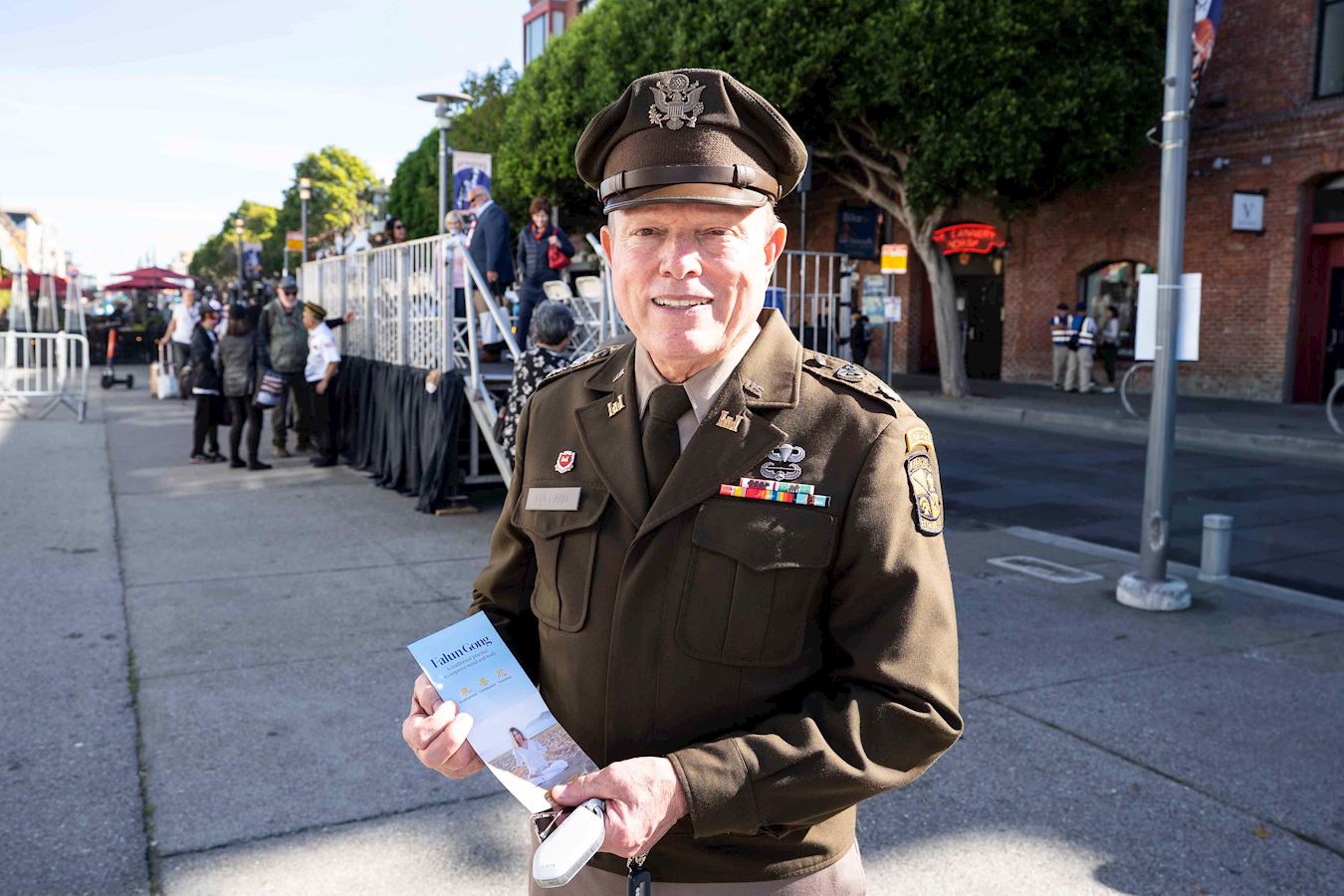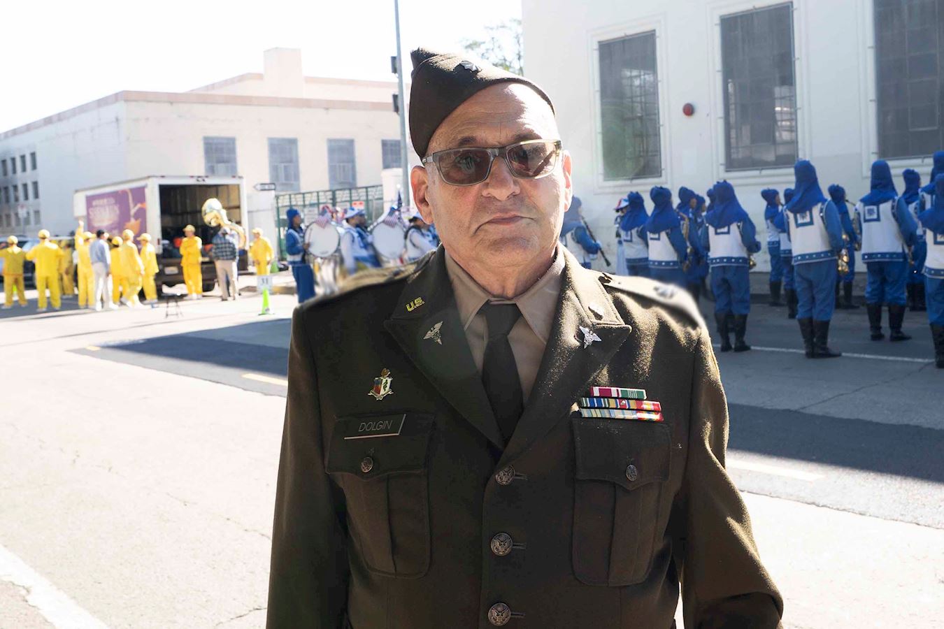 前部隊指揮官史蒂夫﹒多爾金(Steve Dolgin)經過法輪功學員的隊伍時,豎起了大拇指:「做的好。」「他們太美了,他們演奏的樂曲太棒了。我們的世界太需要真、善、忍了。任何地方都需要真、善、忍。」