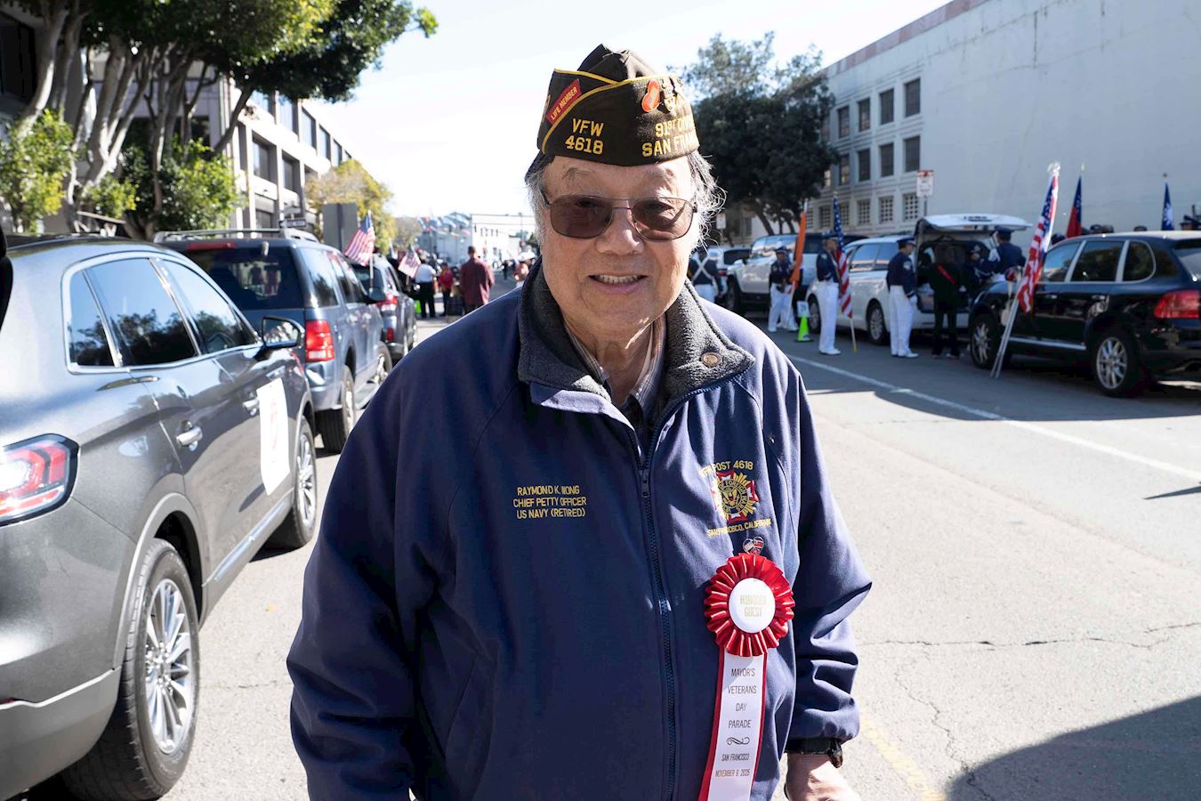 華裔老兵黃國仁是美國退伍軍人協會第十五分會指揮官,也是遊行主辦方之一,他非常歡迎法輪功學員參加遊行。