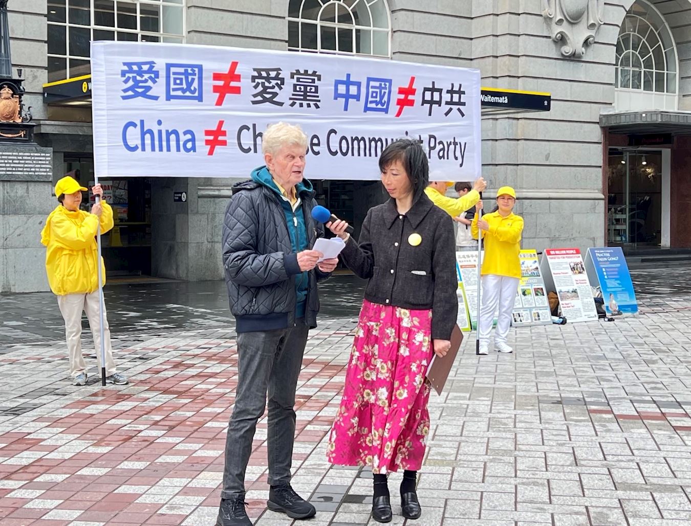 前奧克蘭公民自由委員會(Auckland Council for Civil Liberties)主席巴裏﹒威爾森(Barry Wilson)發表講話,強烈聲援法輪功學員長期以來揭露中共人權迫害的努力,並再次呼籲國際社會關注持續二十六年的暴行。