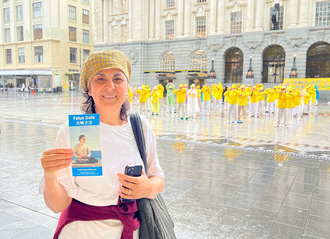 尼萊(Nilay)是一名醫生,也是一名瑜珈老師。當日路過廣場時,被法輪功學員平和的煉功場景吸引,並主動分享自己的感受。