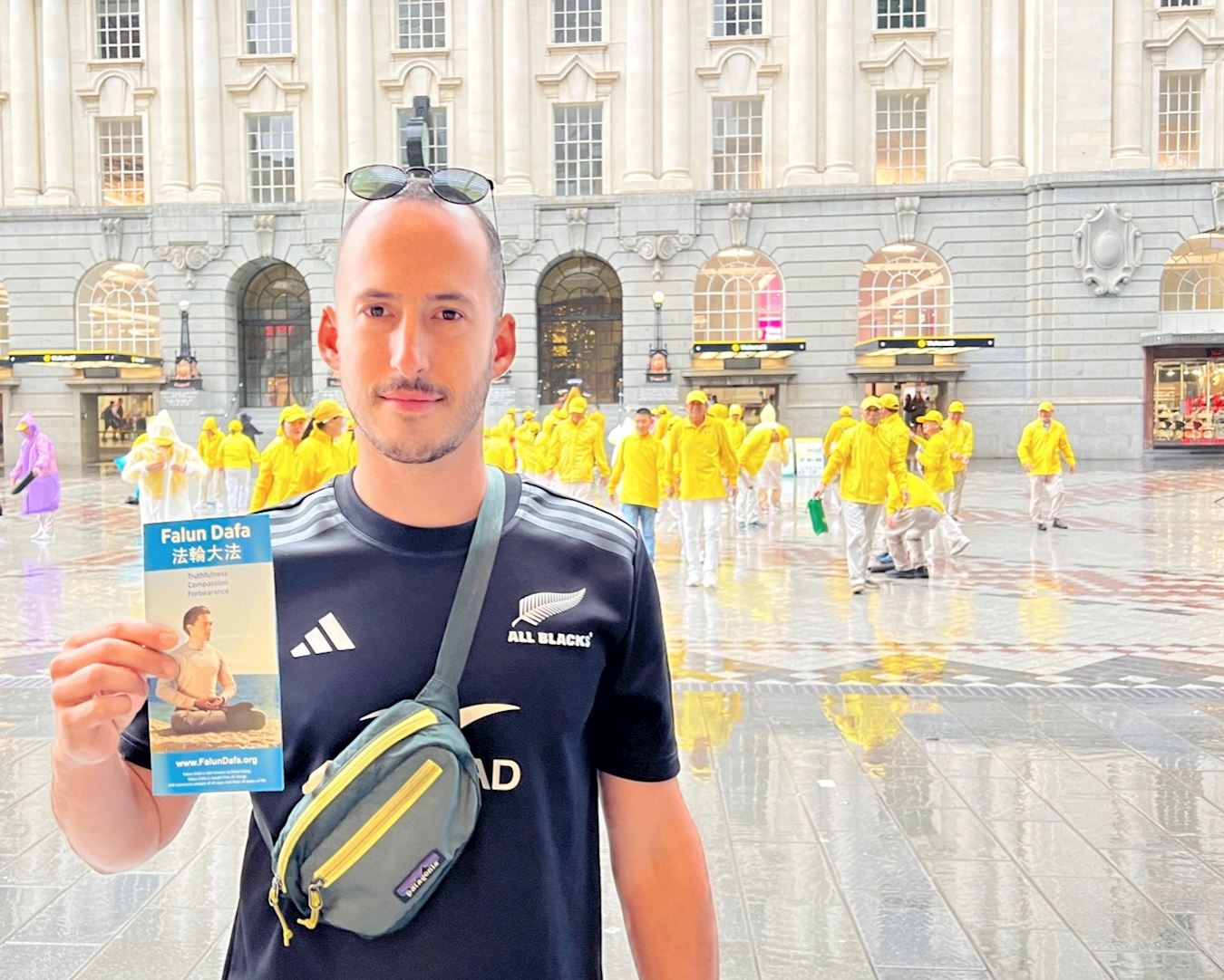 一位來自法國的遊客亞歷克斯(Alex)偶然路過,與當地法輪功學員進行了交流。他回憶起八年前在哥倫比亞旅行時,第一次接觸法輪功,並表達了對功法所帶來平靜與身心提升的深刻印象。
