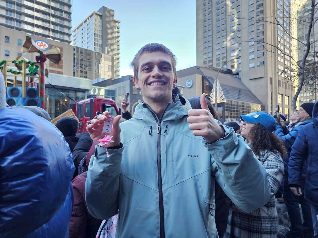盧卡斯(Lucas)是麥基爾大學的意大利交換生, 「太棒了!」他激動地說,「可能最吸引眼球的是他們的服裝。但音樂一響起,簡直太棒了,非常好聽。」他非常贊同法輪大法的真善忍理念。 「這三點都很關鍵,」他認真解釋道,「真很重要,善必不可少,忍更是至關重要。」