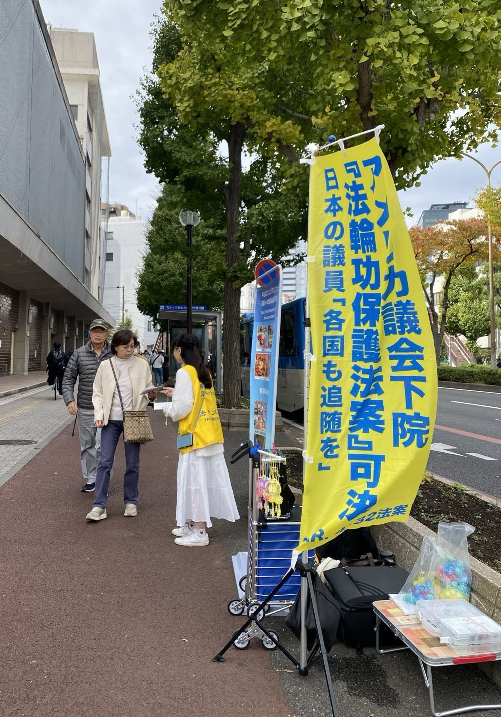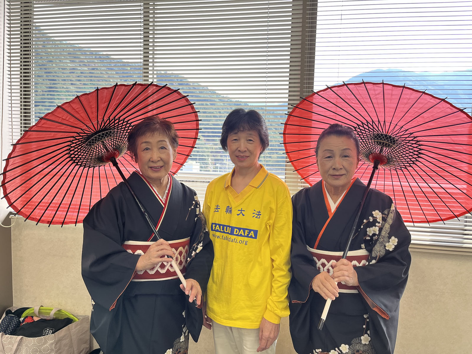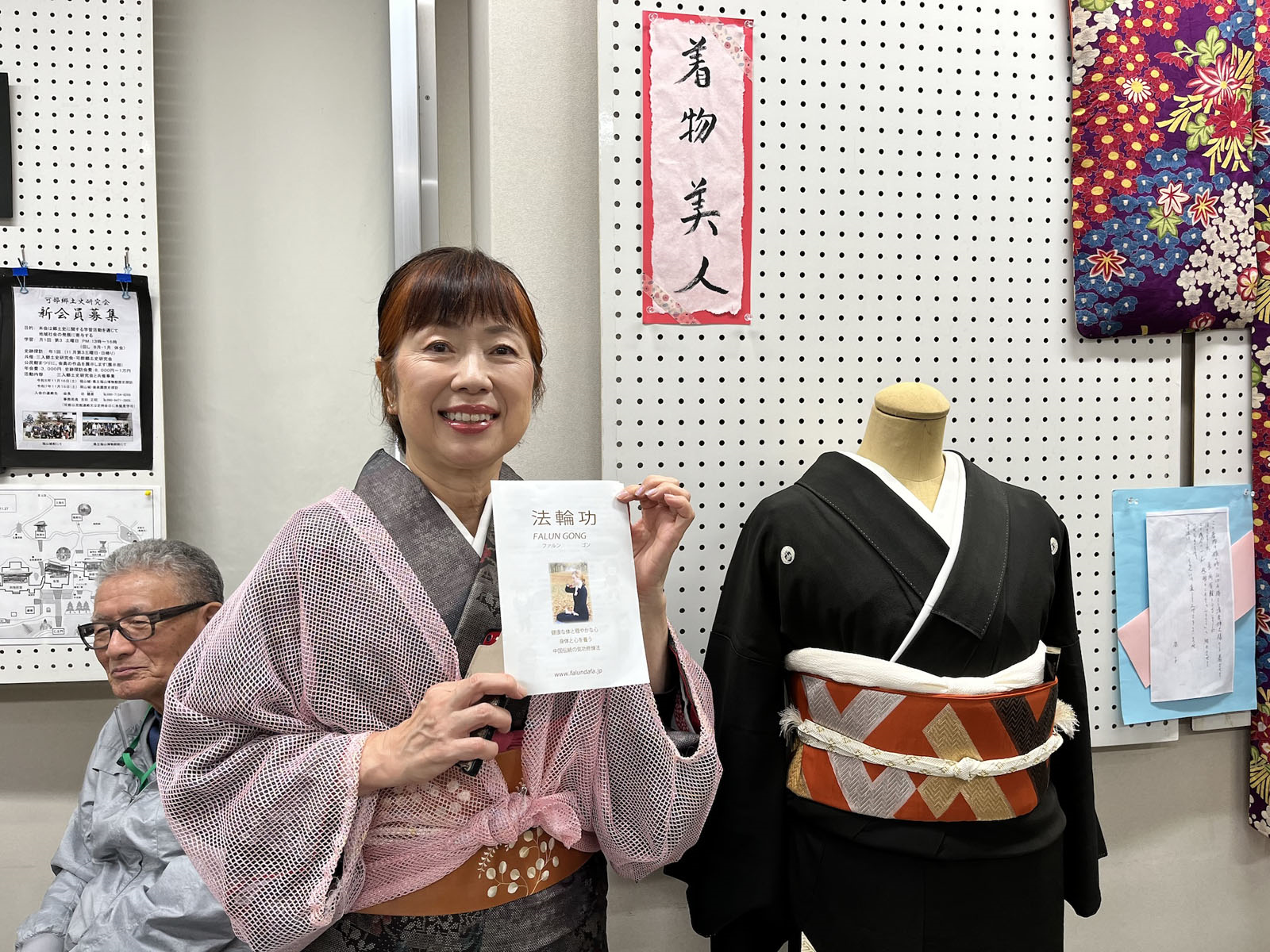 「和服美人」團體的指導教師安田女士聽完法輪功學員的介紹後,很贊同真善忍的理念,表示如果趕上休息日,會到可部公民館的教功教室學功,並和學員交換了聯繫方式。