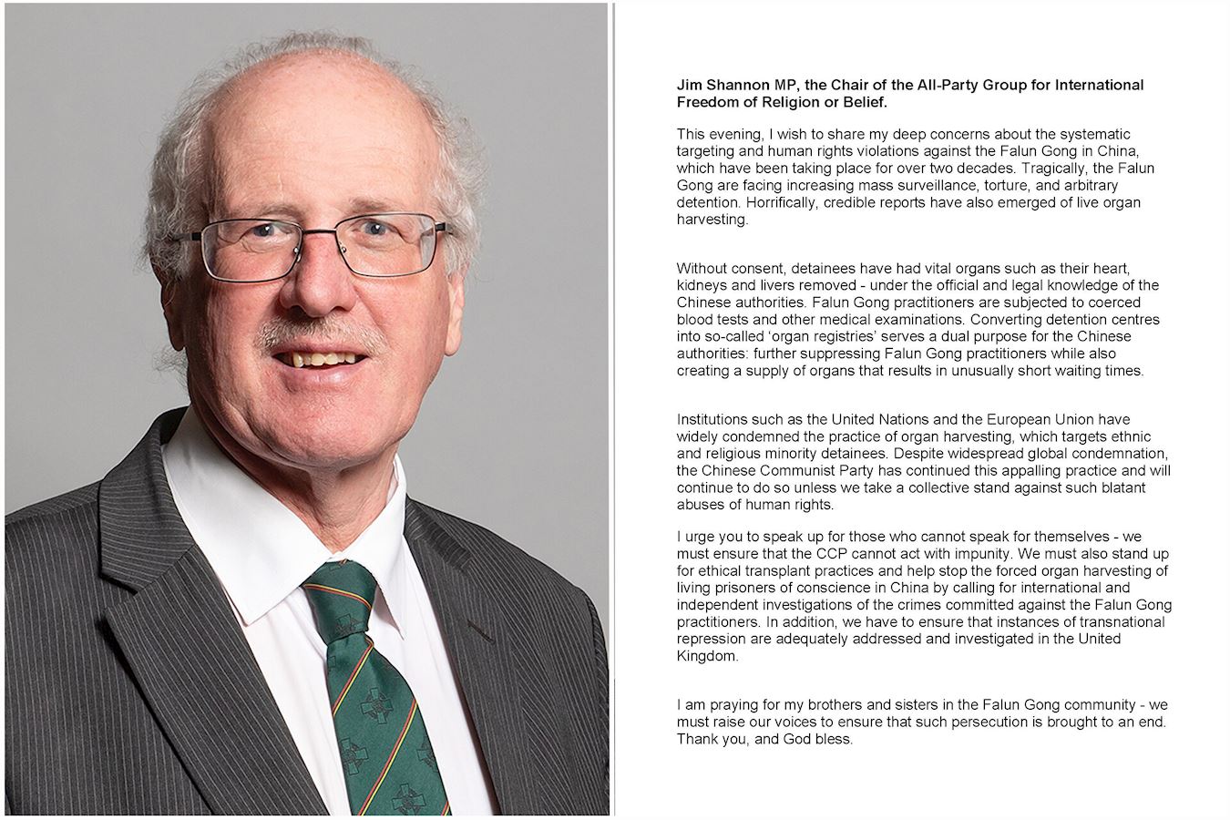 國際宗教或信仰自由跨黨派議會小組(APPG for International Freedom of Religion or Belief)主席,吉姆﹒香農議員(Jim Shannon MP):
