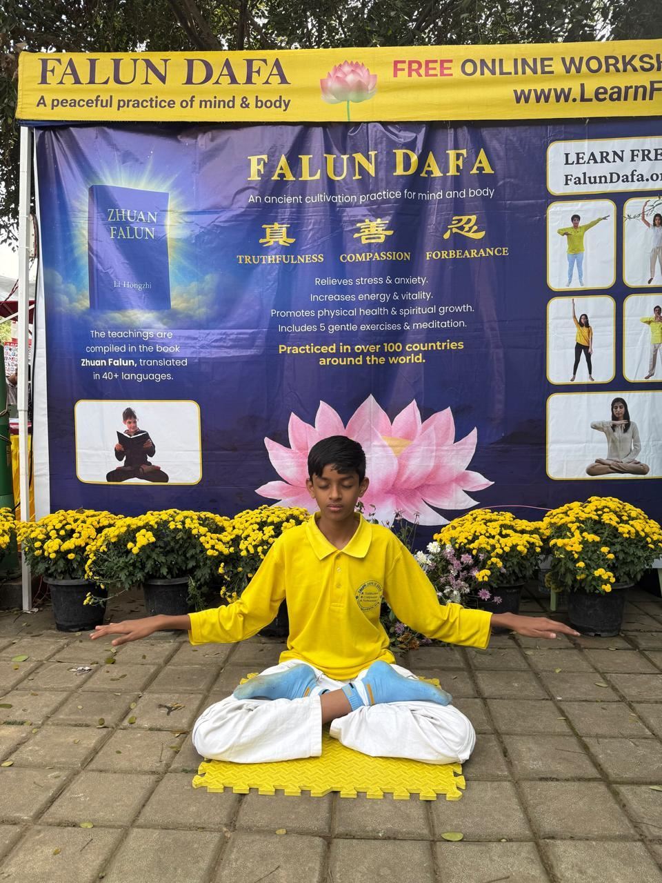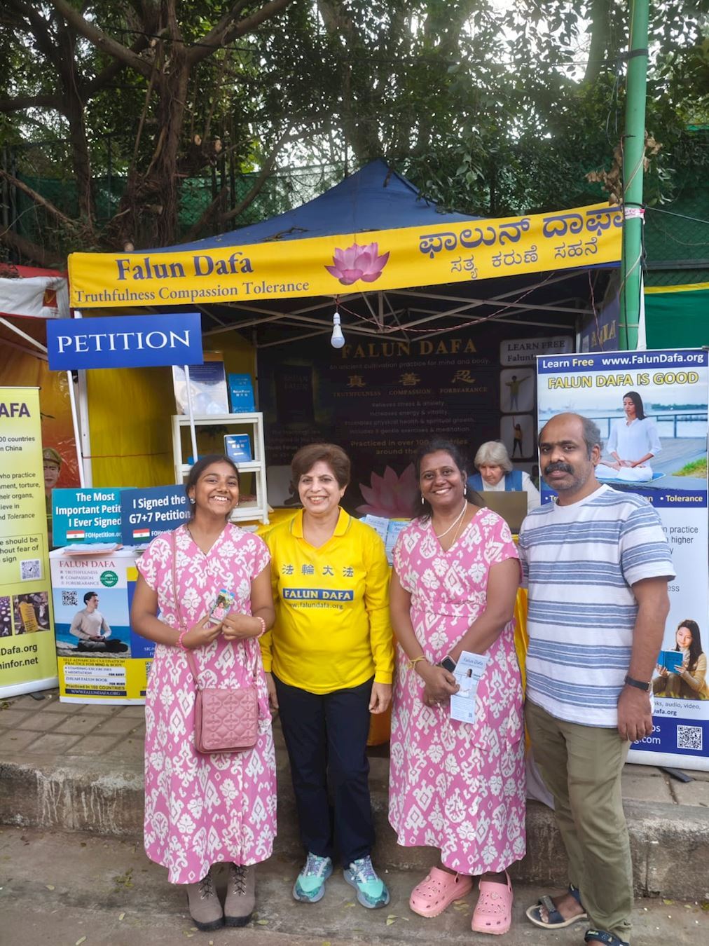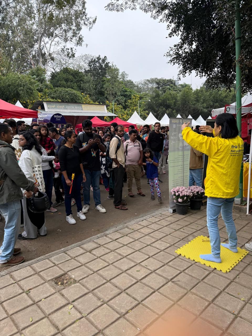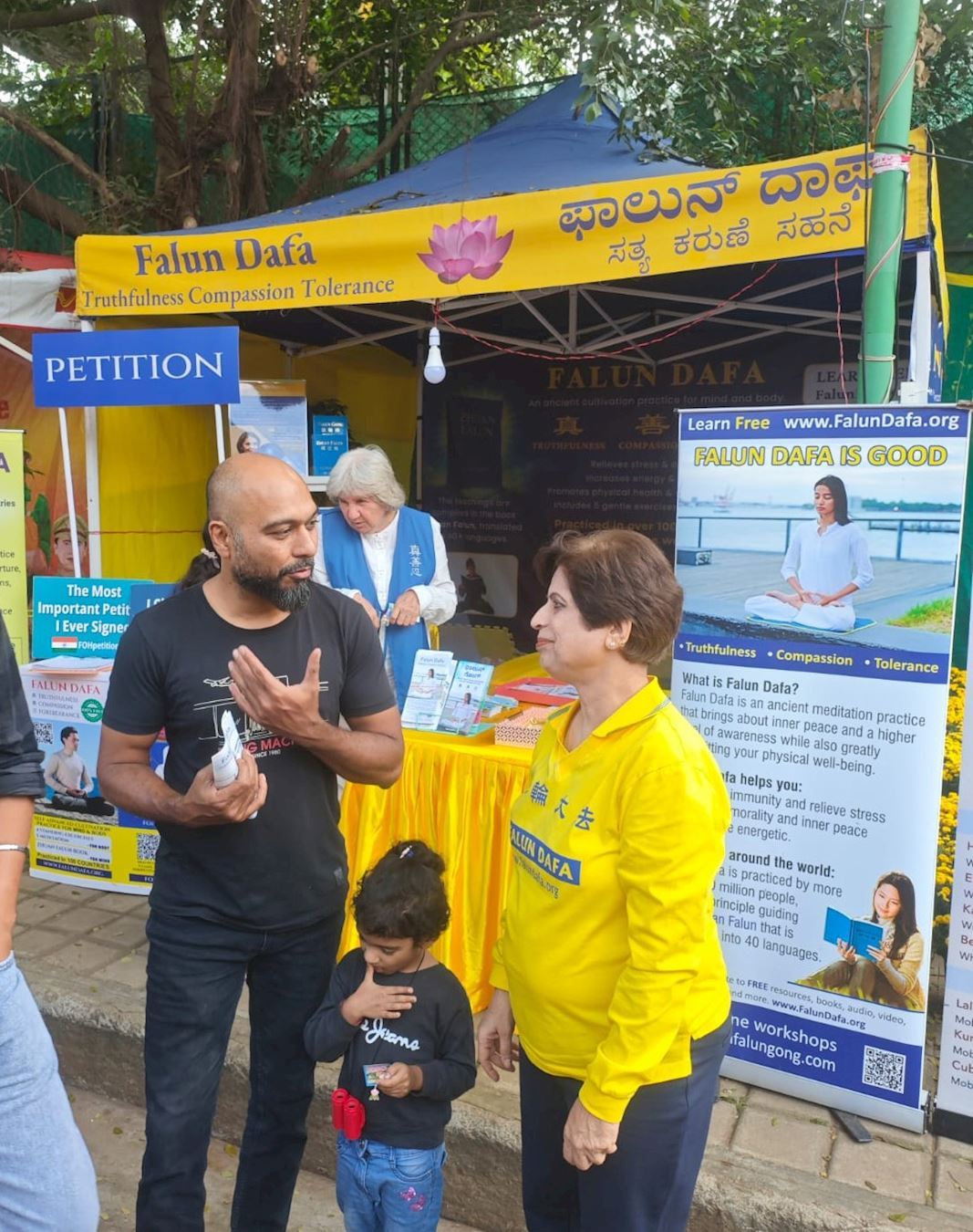 桑托什(Santhosh)在法輪功學員的展位前停下了腳步,他肯定了學員們的做法,認為很有意義。他說:「你們所做的是偉大的善舉。」他對學員們所秉持的高尚的道德標準表示敬佩。