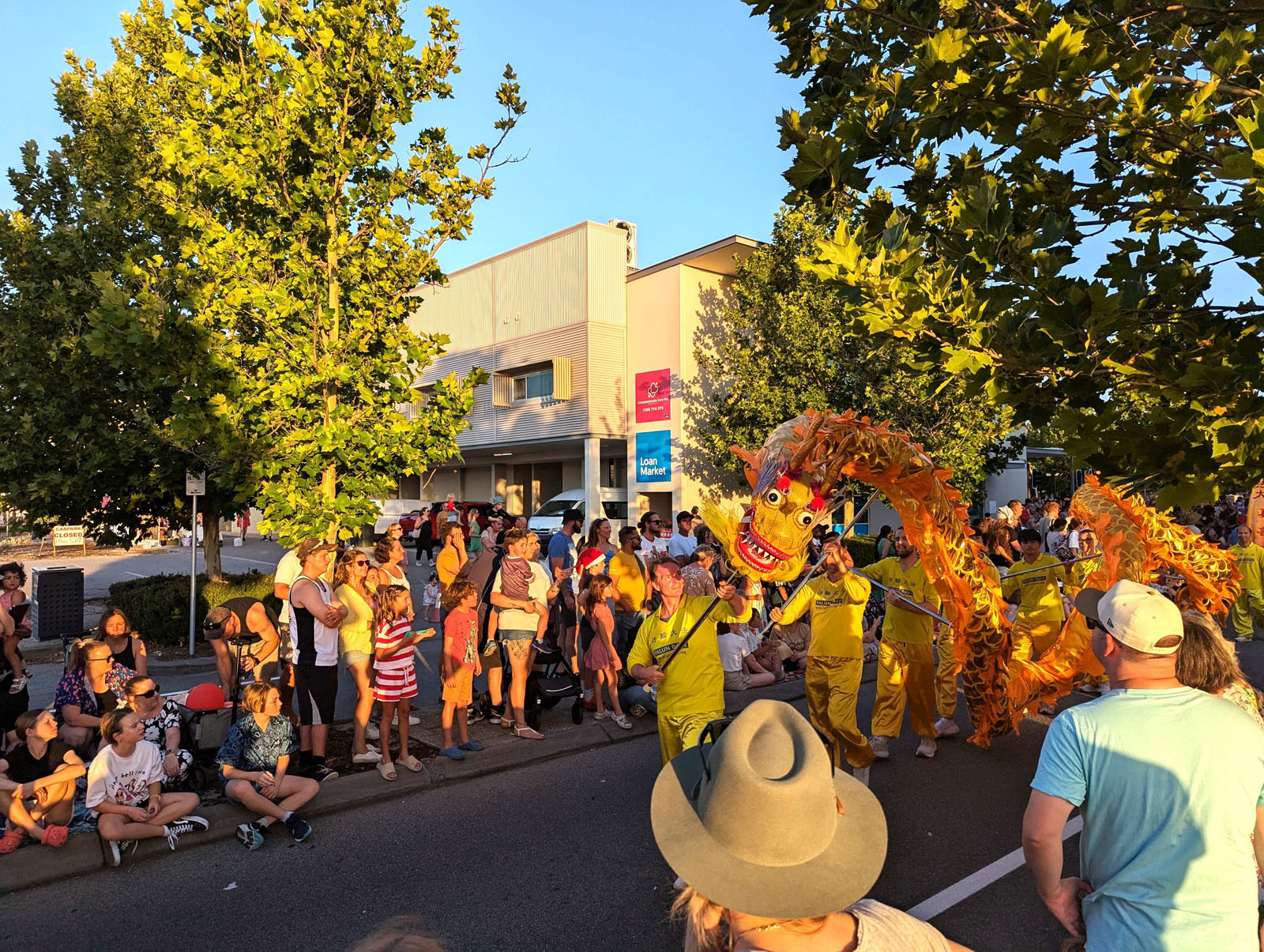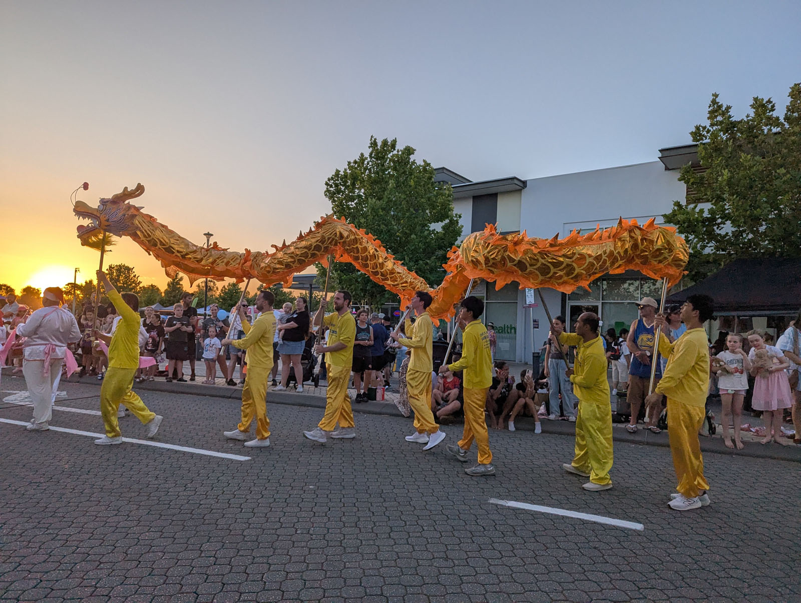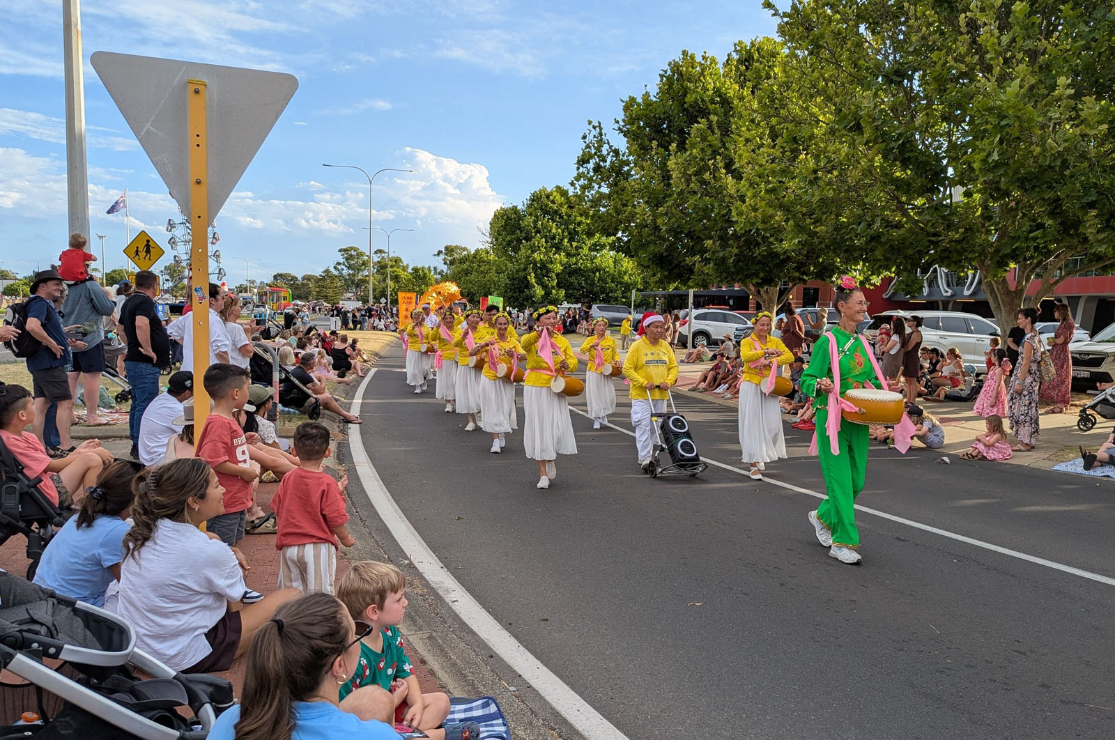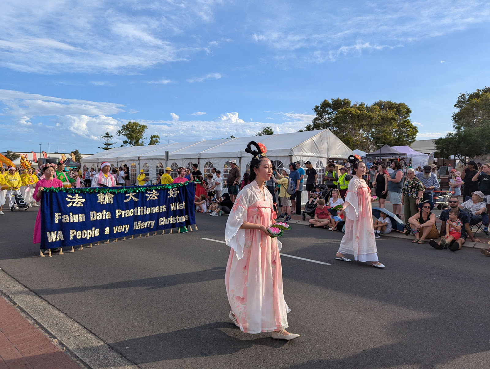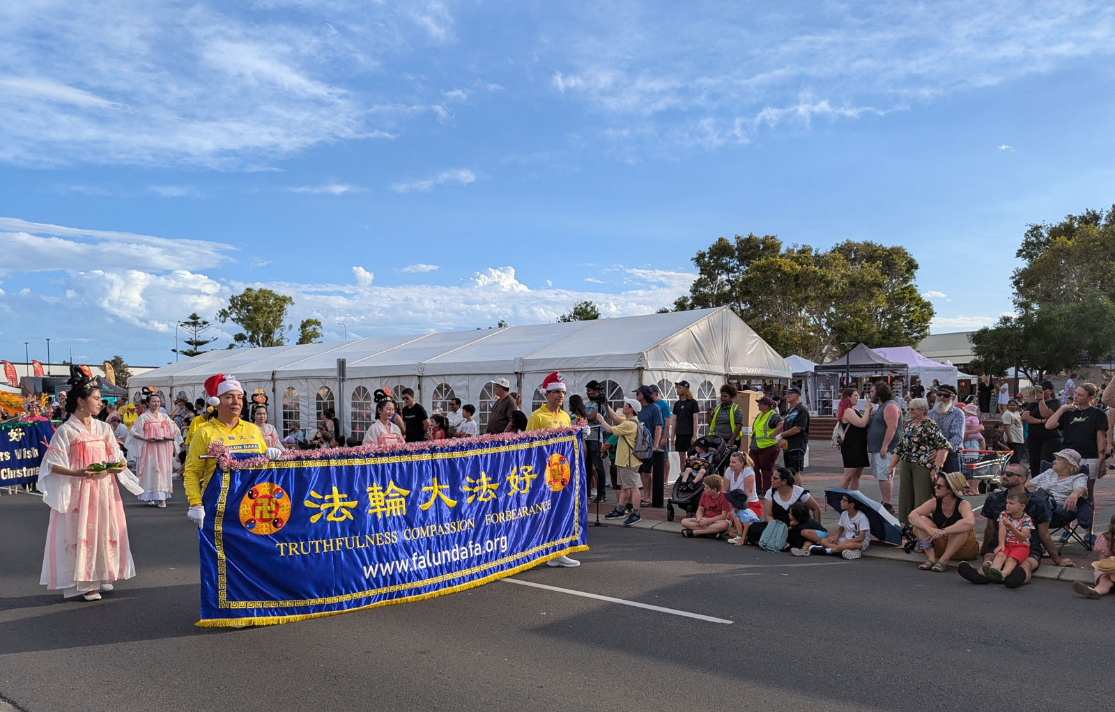 十二月十四日傍晚,在班伯利(Bunbury)市舉行的聖誕遊行中,西澳法輪功學員的遊行隊伍格外引人矚目。由法輪功學員的仙女隊、腰鼓隊、彩旗隊和舞龍隊組成的遊行方陣,色彩明亮絢麗,鼓聲振奮人心,氣氛祥和美好,威武矯健的金龍與觀眾們的熱情互動,更是贏來一片驚喜與掌聲。
