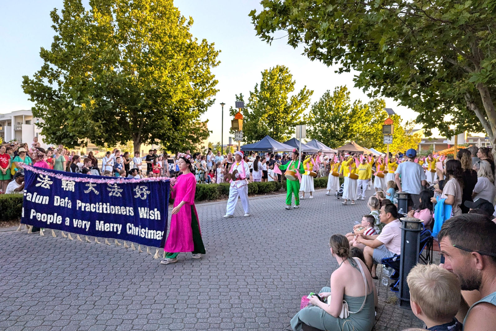 法輪功學員也參加了當天傍晚開始的聖誕遊行,將法輪大法的美好與祝福帶給當地居民。