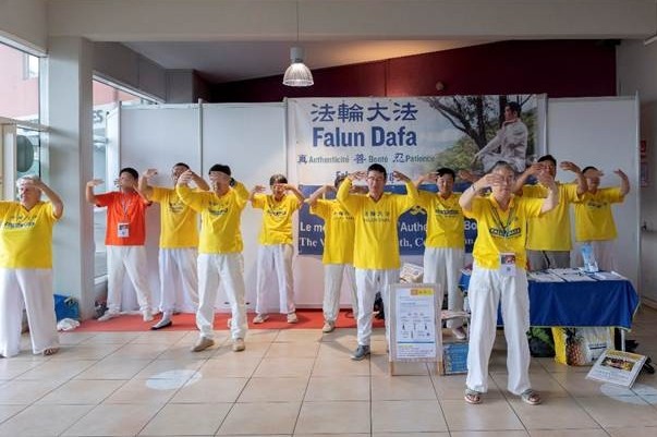 現場,法輪大法舒緩、祥和的音樂吸引了不少參觀者駐足。學員們主動向來自不同背景的人士介紹法輪大法;現場演示功法;並講解以真、善、忍為原理的修煉方式已使全球無數人受益。