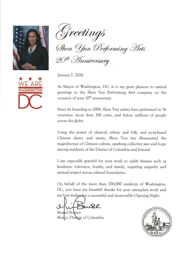 值此神韻藝術團成立二十週年之際,作為華盛頓哥倫比亞特區市長,我非常榮幸地向神韻藝術團致以祝賀。