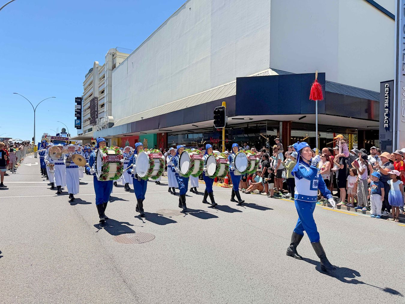 ![]() 圖9:二零二五年十二月六、七日由法輪功學員組成腰鼓隊參加了蒂阿瓦木圖(Te Awamutu)、劍橋鎮(Cambridge)的聖誕遊行。 |