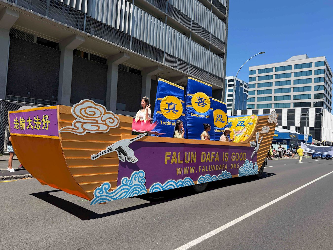 腰鼓隊以整齊劃一的鼓陣、乾淨俐落的鼓點和富有節奏感的舞步,瞬間點燃節日氛圍,贏得觀眾陣陣喝彩。舞龍隊以靈動有力的龍身、活潑明快的節奏在街道上翻躍穿梭。後面造型精緻的「法船」花車緩緩駛來,藍色船帆上中英文金色的「真、善、忍」在陽光下閃耀,格外引人注目。