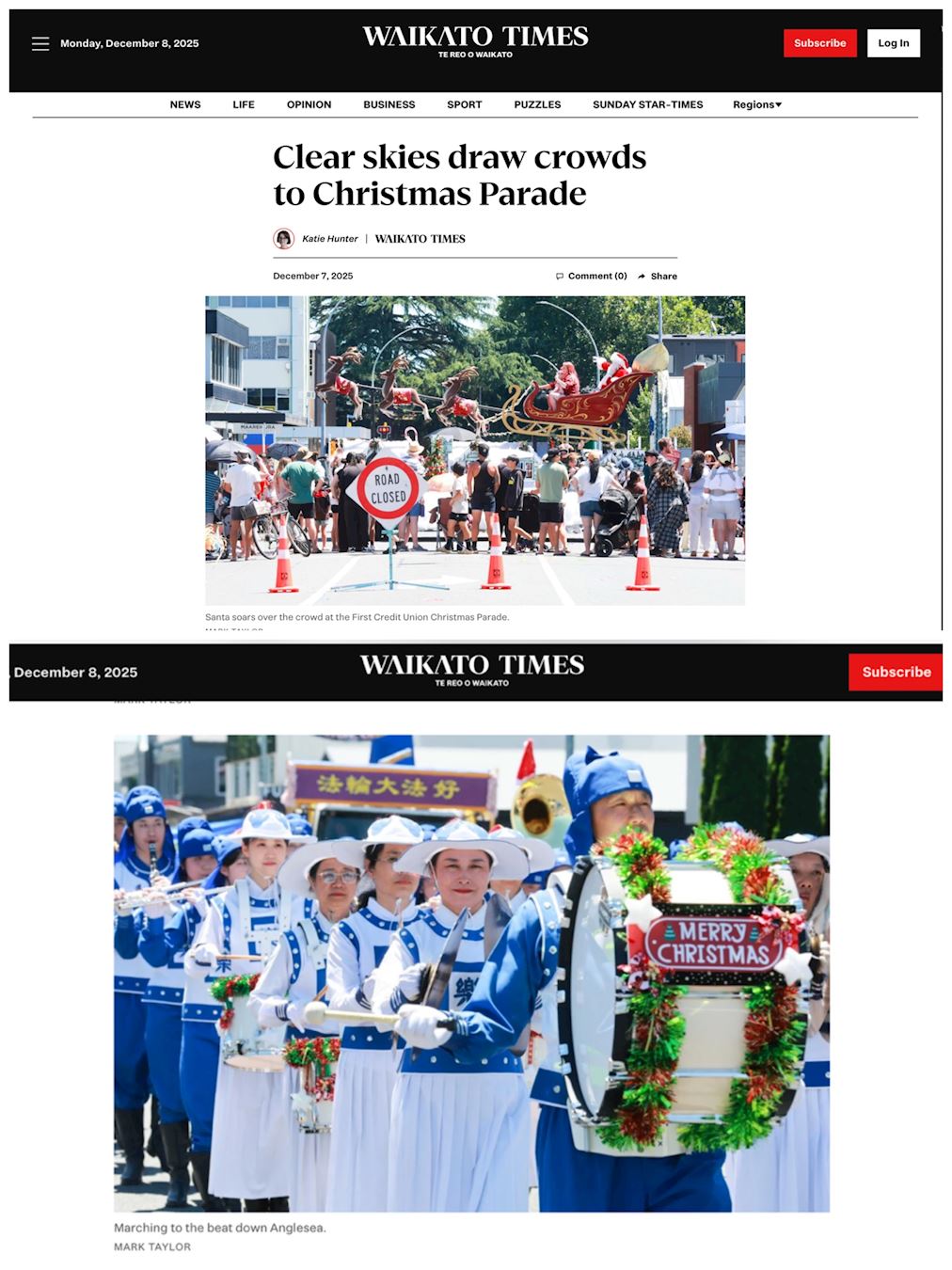 新西蘭漢密爾頓主流媒體《懷卡托時報》(Waikato Times)也報導了此次盛大的遊行活動,並刊登了法輪功團體的現場照片,成為當地聖誕季中一道亮麗的新聞焦點。