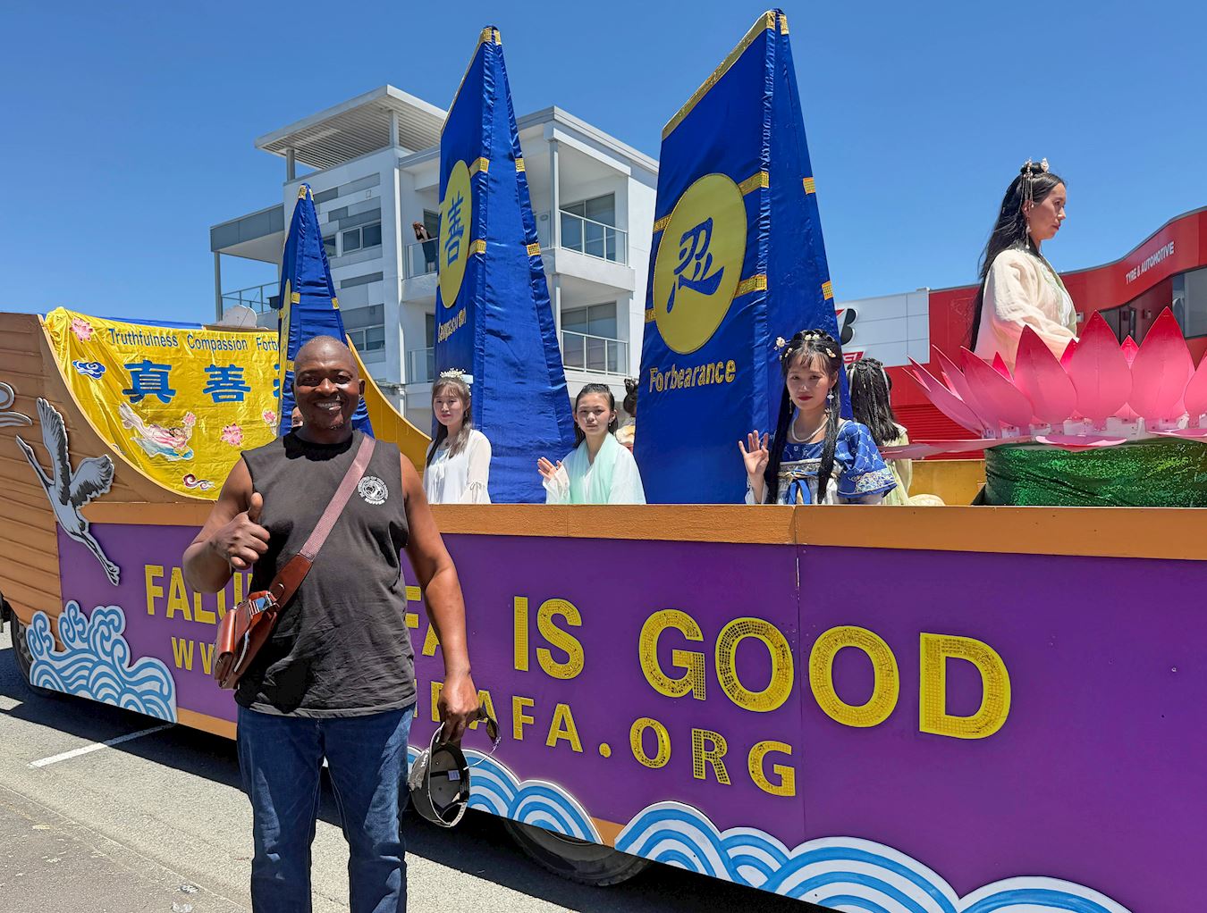 來自非洲的移民戈弗雷(Godfrey)來到新西蘭僅三個月,在一家礦業公司工作,從事鑽探與礦產勘探,這是他第一次看到法輪功團體的遊行隊伍,第一次看見他們如此獨特的傳統中國古典服飾。「他們的服飾太美了,」他說,「我喜歡傳統文化。我真的很喜歡看到這樣的表演。我感覺自己彷彿走進電影,太精彩了!」
